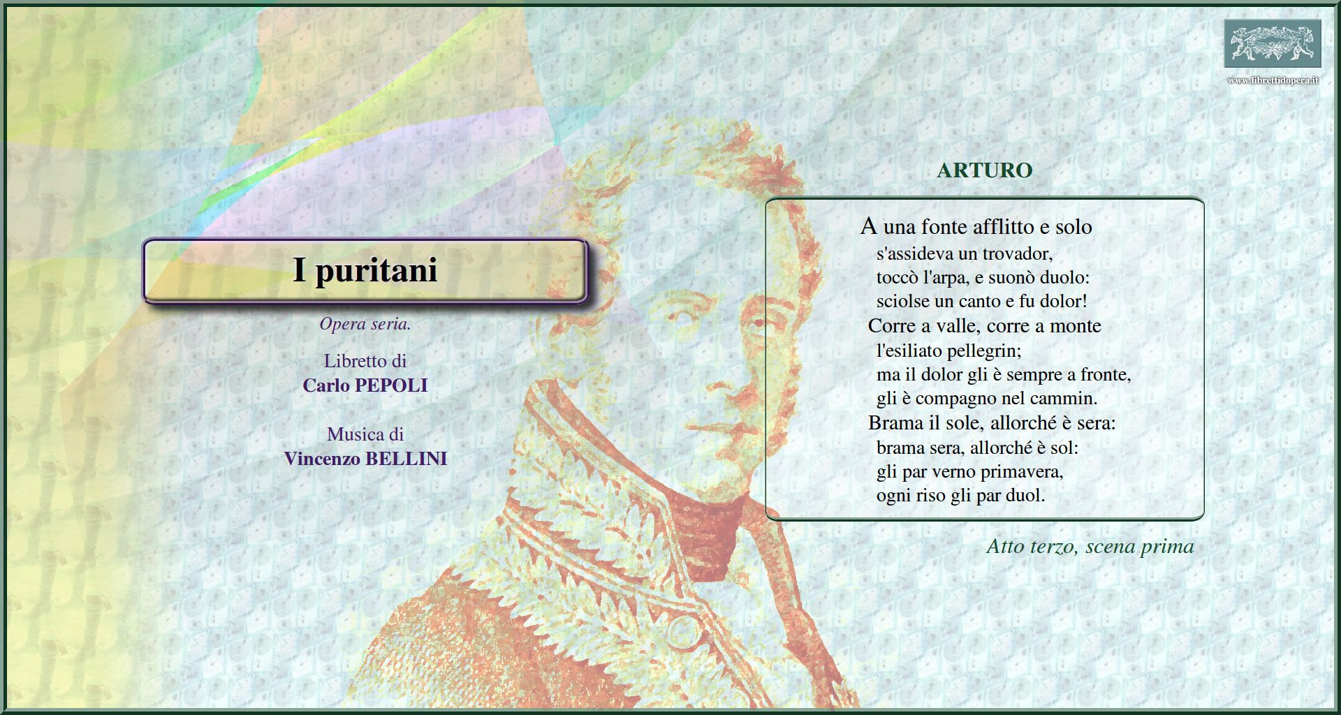 Ah per sempre io ti perdei A te, o cara, amor talora Son vergin vezzosa, in veste di sposa? Cinta di rose e col bel crin disciolto Qui la voce sua soave A una fonte afflitto e solo