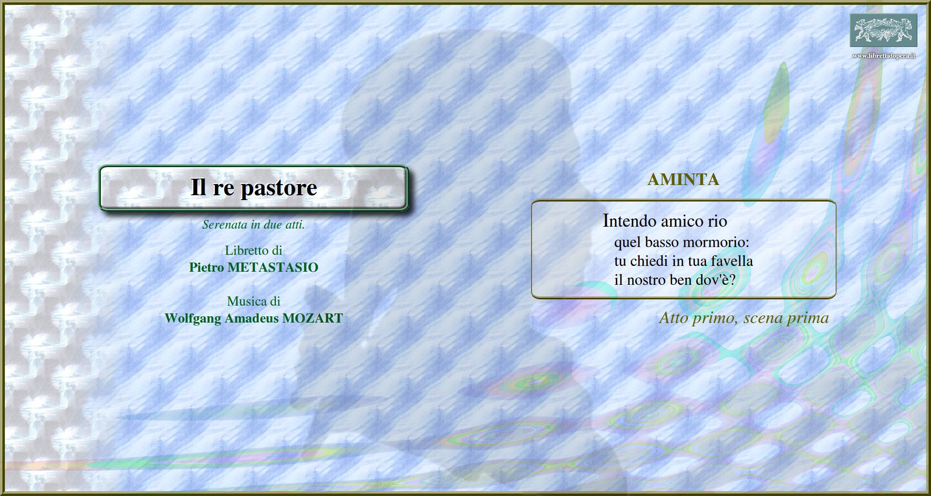 Alla selva, al prato, al fonte Intendo amico rio Aer tranquillo e dì sereni Se vincendo vi rendo felici L'amerò, sarò costante Sol può dir come si trova