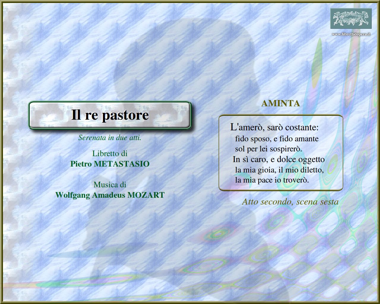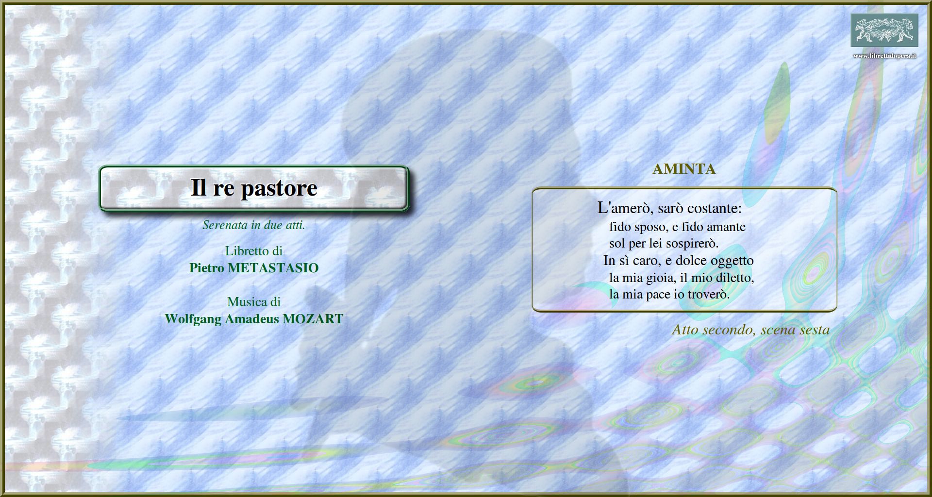 Alla selva, al prato, al fonte Intendo amico rio Aer tranquillo e dì sereni Se vincendo vi rendo felici L'amerò, sarò costante Sol può dir come si trova