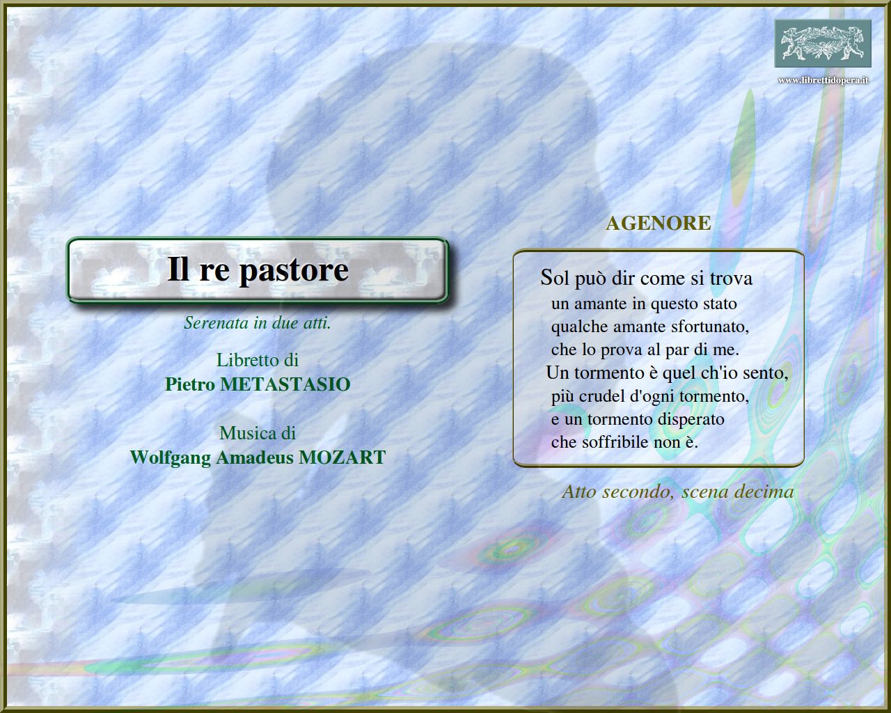 Alla selva, al prato, al fonte Intendo amico rio Aer tranquillo e dì sereni Se vincendo vi rendo felici L'amerò, sarò costante Sol può dir come si trova