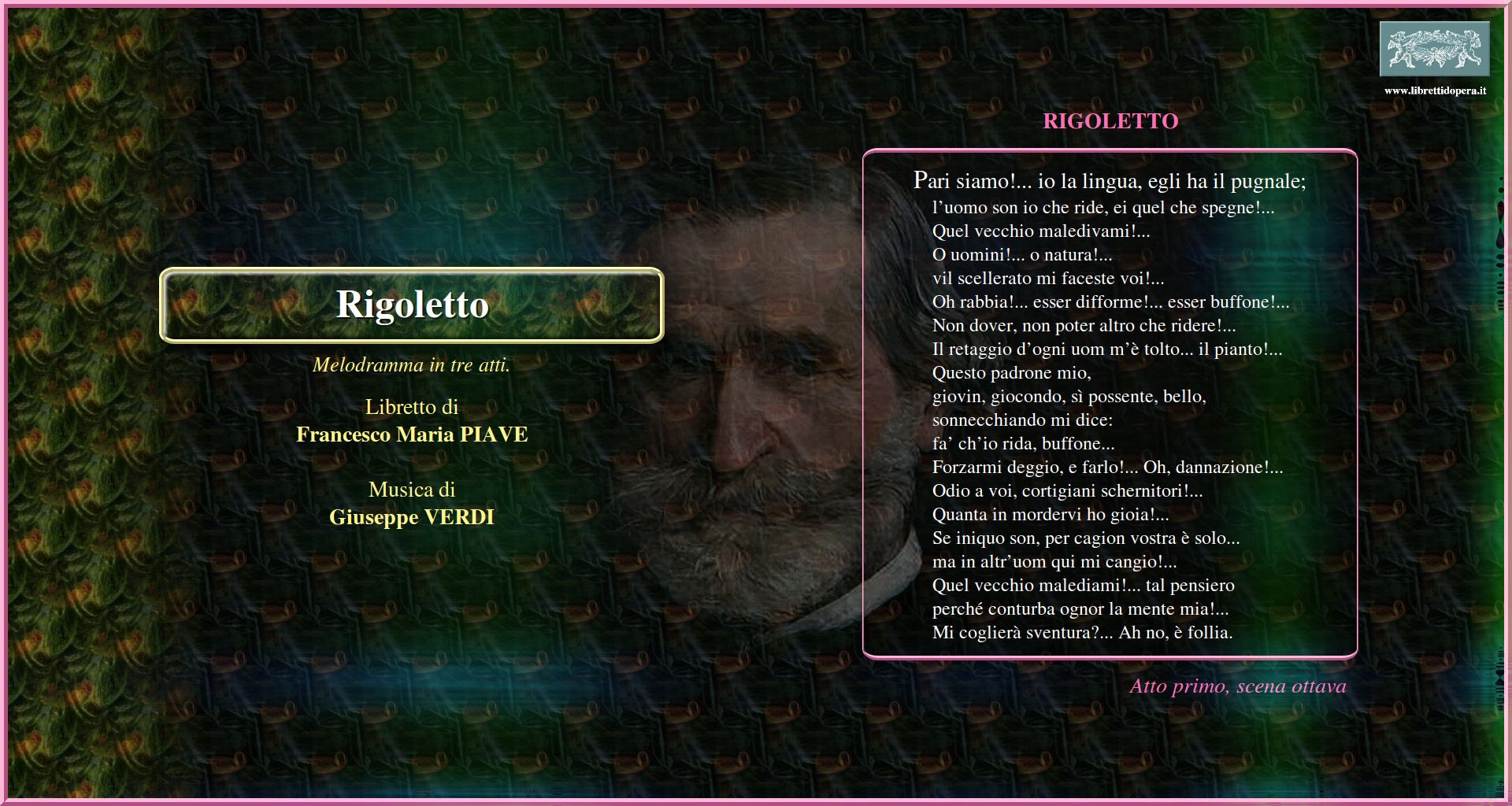 Questa o quella per me pari sono Pari siamo!... io la lingua, egli ha il pugnale Caro nome che il mio cor Cortigiani, vil razza dannata Tutte le feste al tempio Sì, vendetta, tremenda vendetta La donna è mobile Bella figlia dell'amore