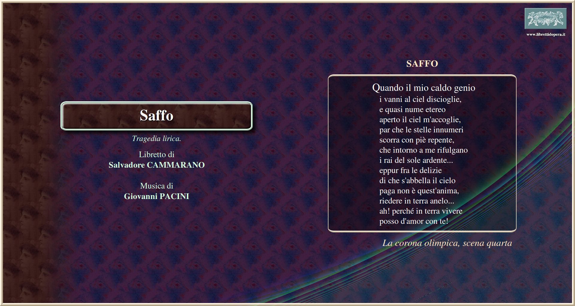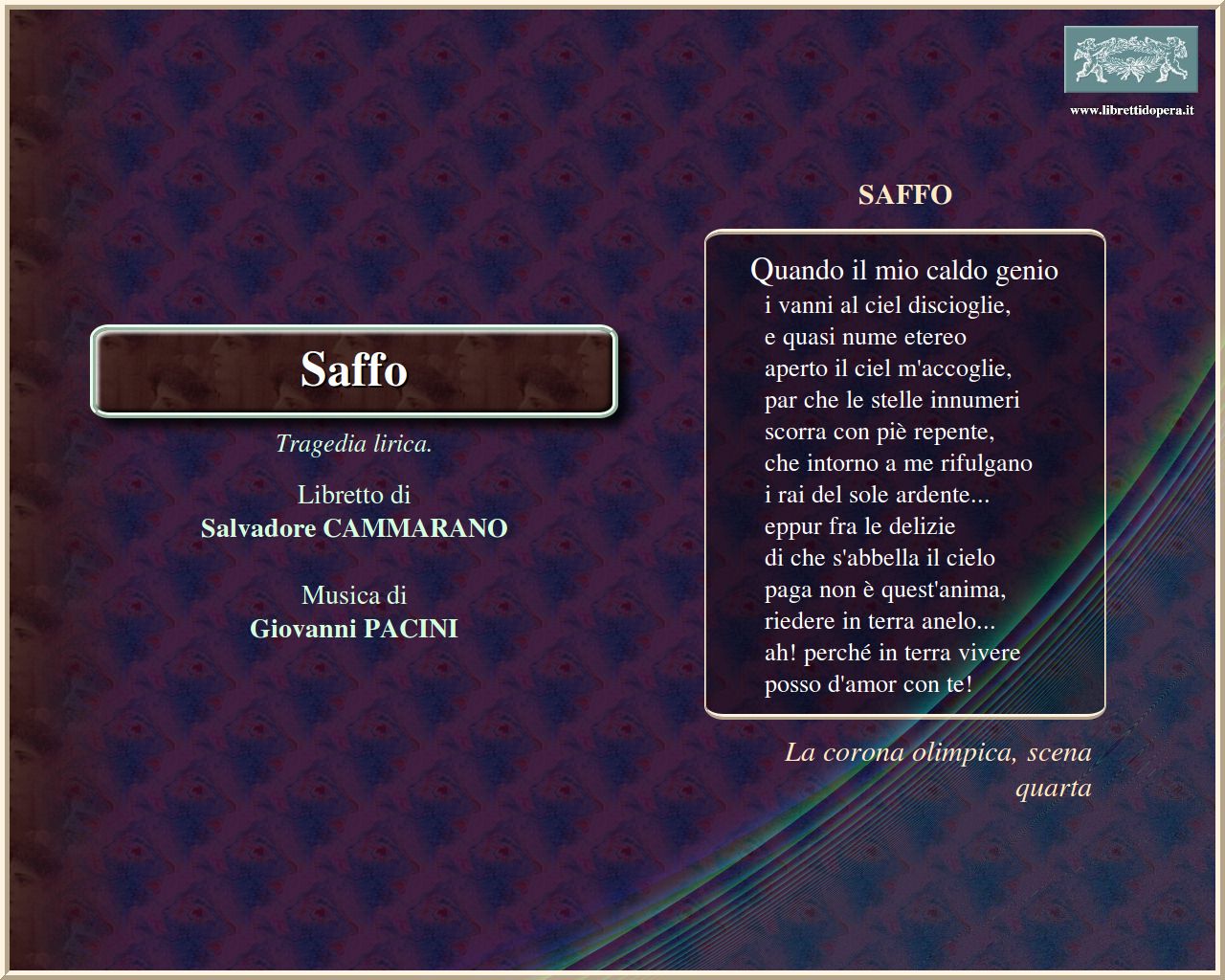 Di sua voce il suon giungea Quando il mio caldo genio Di quai soavi lagrime Ai mortali, o crudo, ai numi Signor di Leucade, occhio del cielo