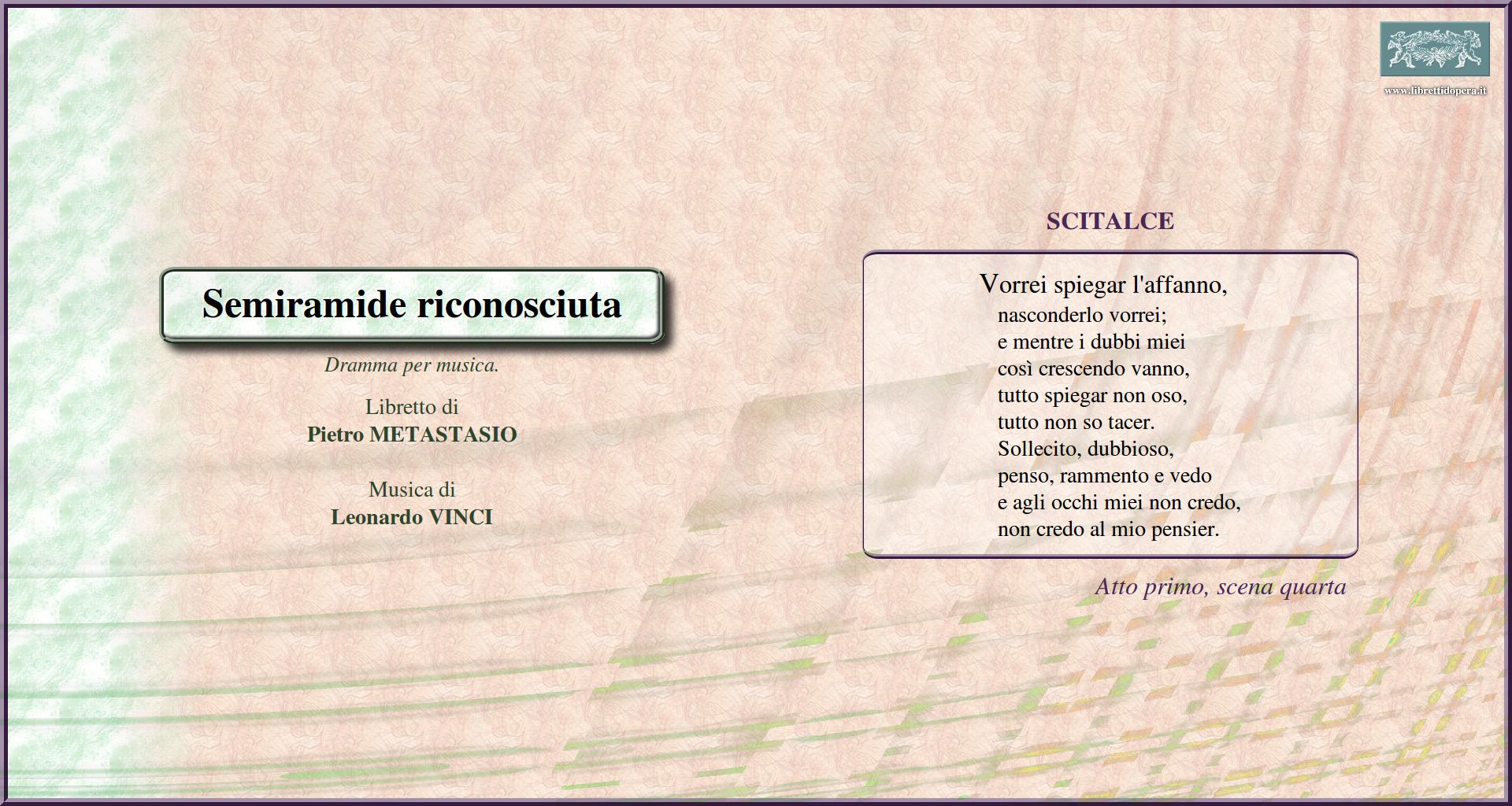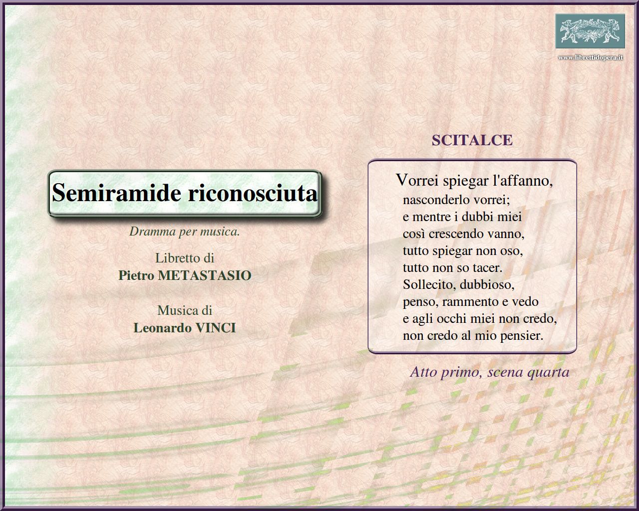 Vorrei spiegar l'affanno Ei d'amor quasi delira Fiumicel, che s'ode appena Passegger, che su la sponda Il ciel mi vuole oppresso Sentirsi dire dal caro bene