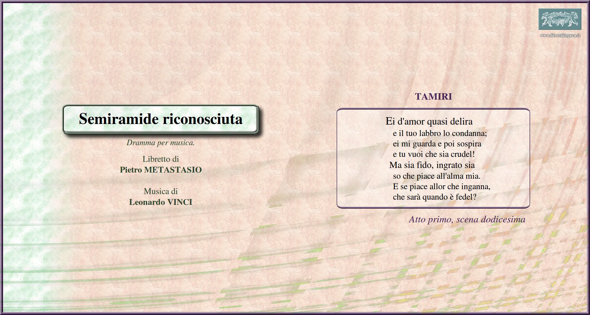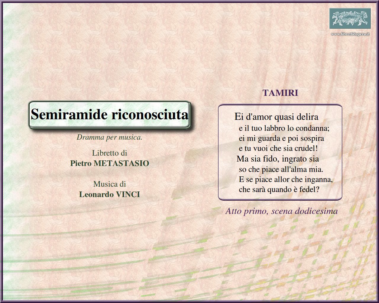Vorrei spiegar l'affanno Ei d'amor quasi delira Fiumicel, che s'ode appena Passegger, che su la sponda Il ciel mi vuole oppresso Sentirsi dire dal caro bene