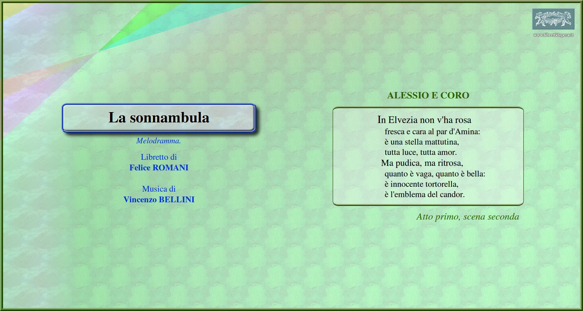 In Elvezia non v'ha rosa Come per me sereno A fosco cielo, a notte bruna Vi ravviso, o luoghi ameni Ah! non giunge uman pensiero Ah! non credea mirarti
