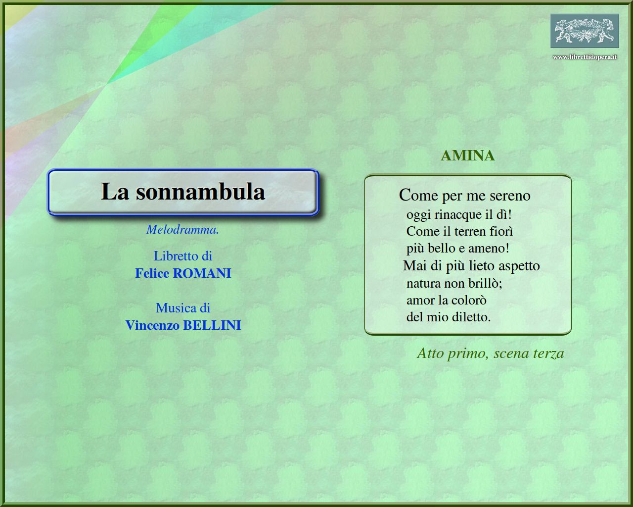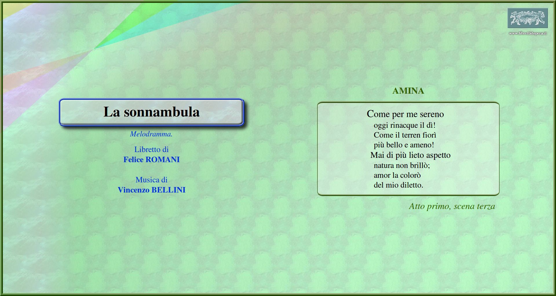 In Elvezia non v'ha rosa Come per me sereno A fosco cielo, a notte bruna Vi ravviso, o luoghi ameni Ah! non giunge uman pensiero Ah! non credea mirarti