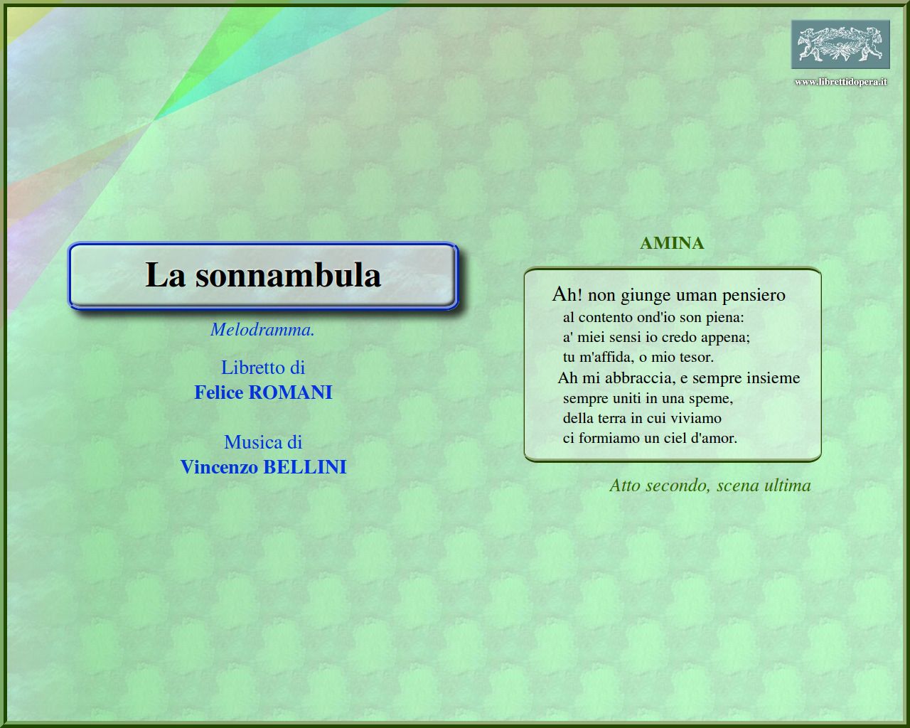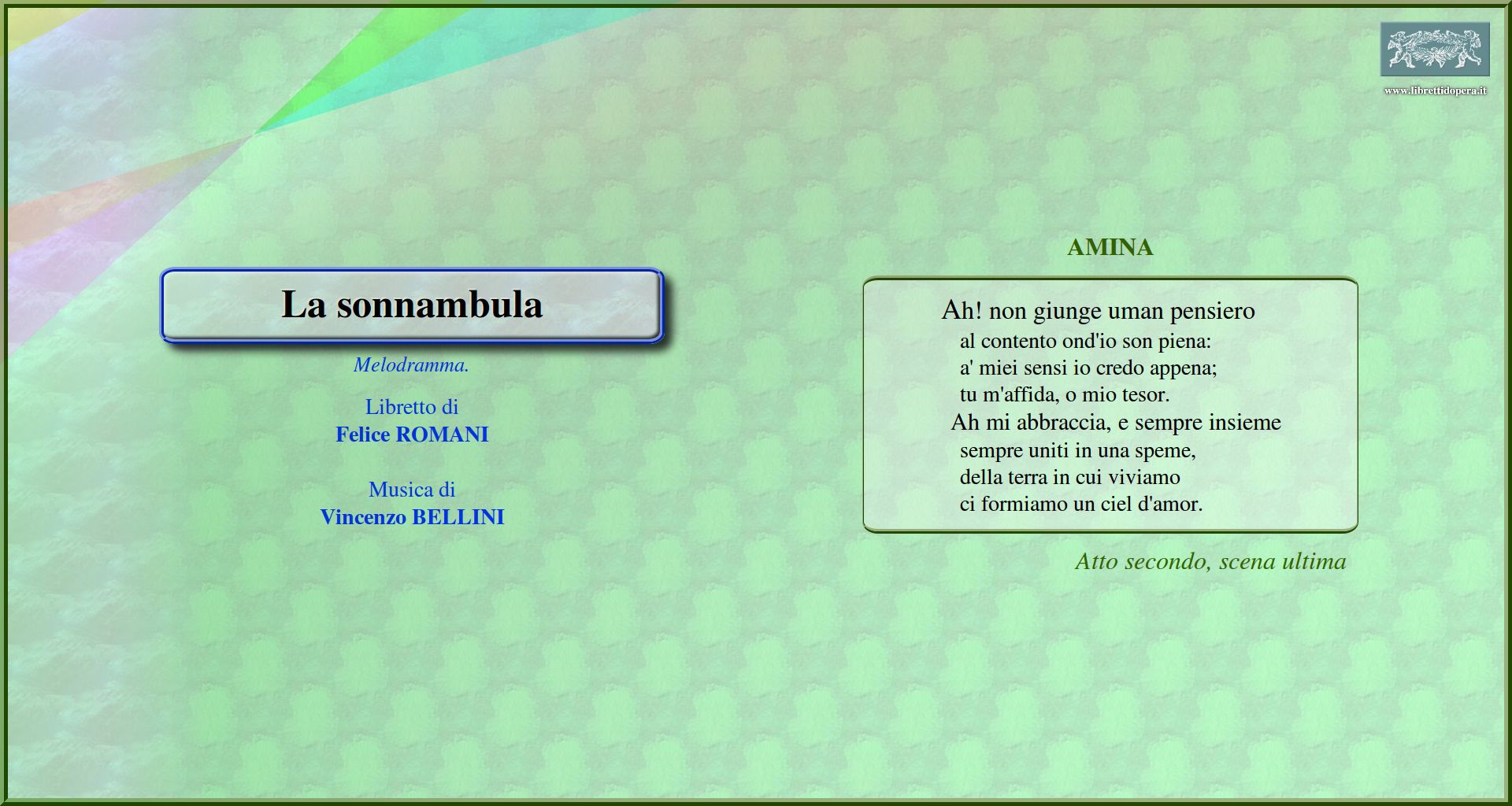 In Elvezia non v'ha rosa Come per me sereno A fosco cielo, a notte bruna Vi ravviso, o luoghi ameni Ah! non giunge uman pensiero Ah! non credea mirarti