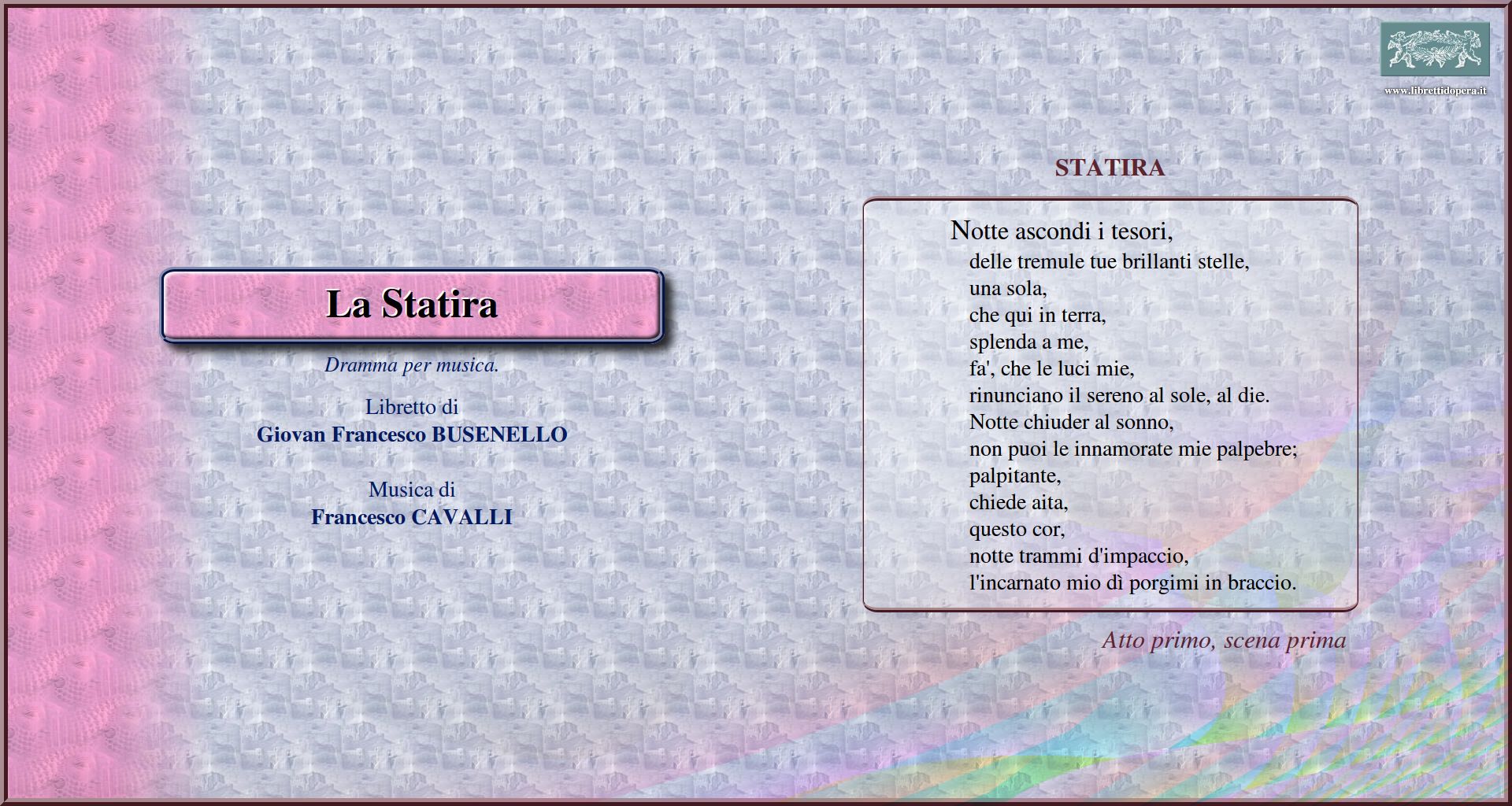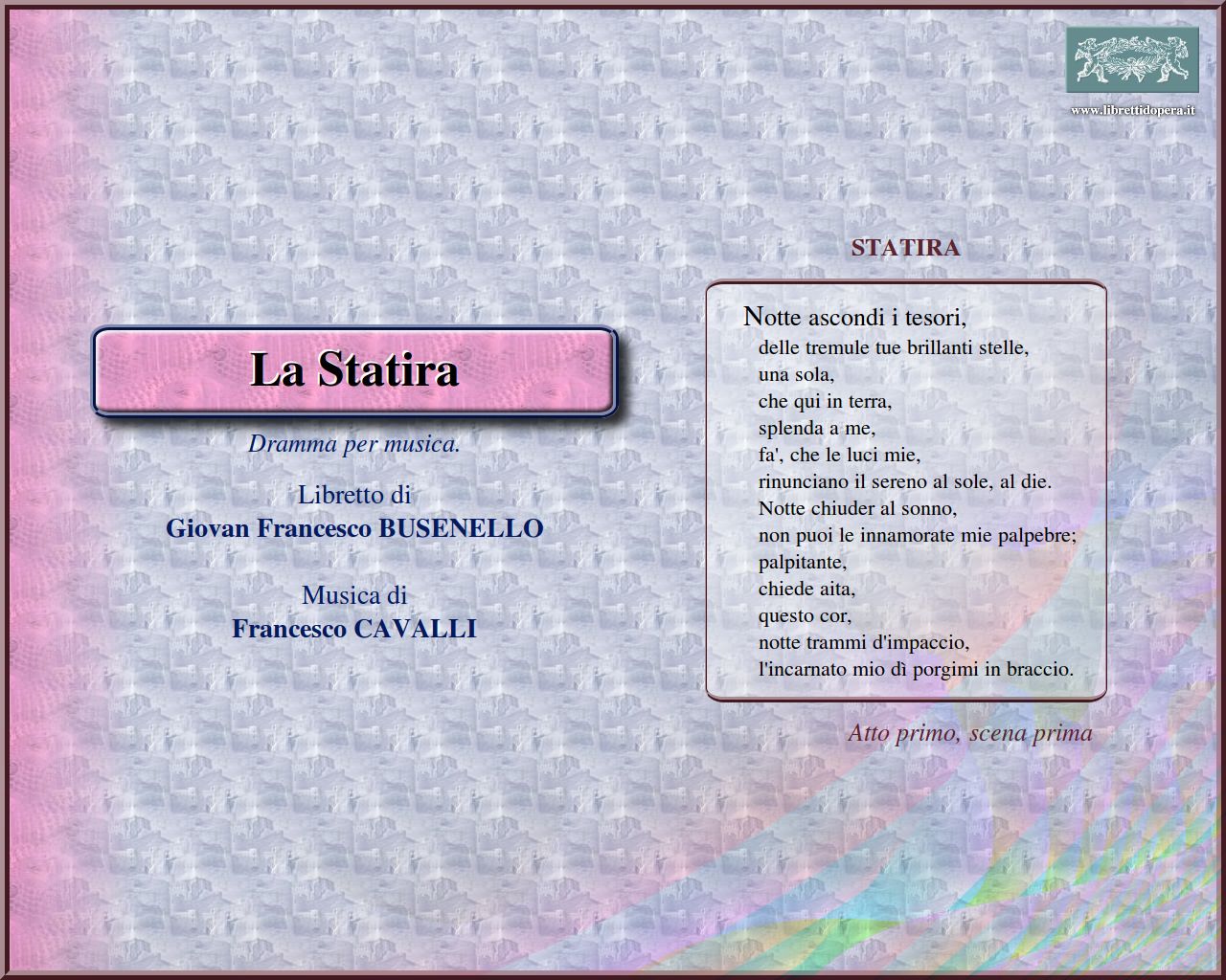 Notte ascondi i tesori Alba, ch'imperli i fiori all'erbe in seno Cresce il foco, avvampa il core In India vo' tornar, corte non voglio Lontananza, la notomia di questo cor tu fai