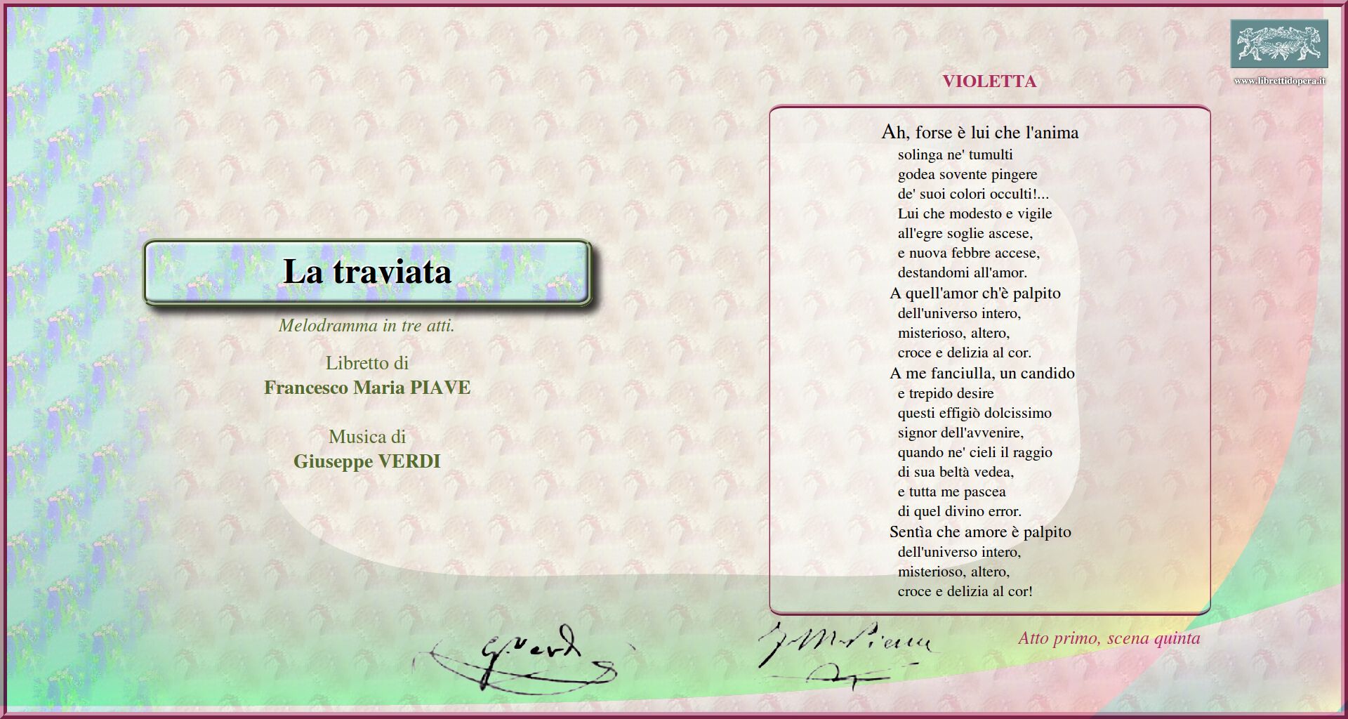 Libiam ne' lieti calici Ah, forse è lui che l'anima De' miei bollenti spiriti Pura siccome un angelo Noi siamo zingarelle Addio, del passato bei sogni ridenti