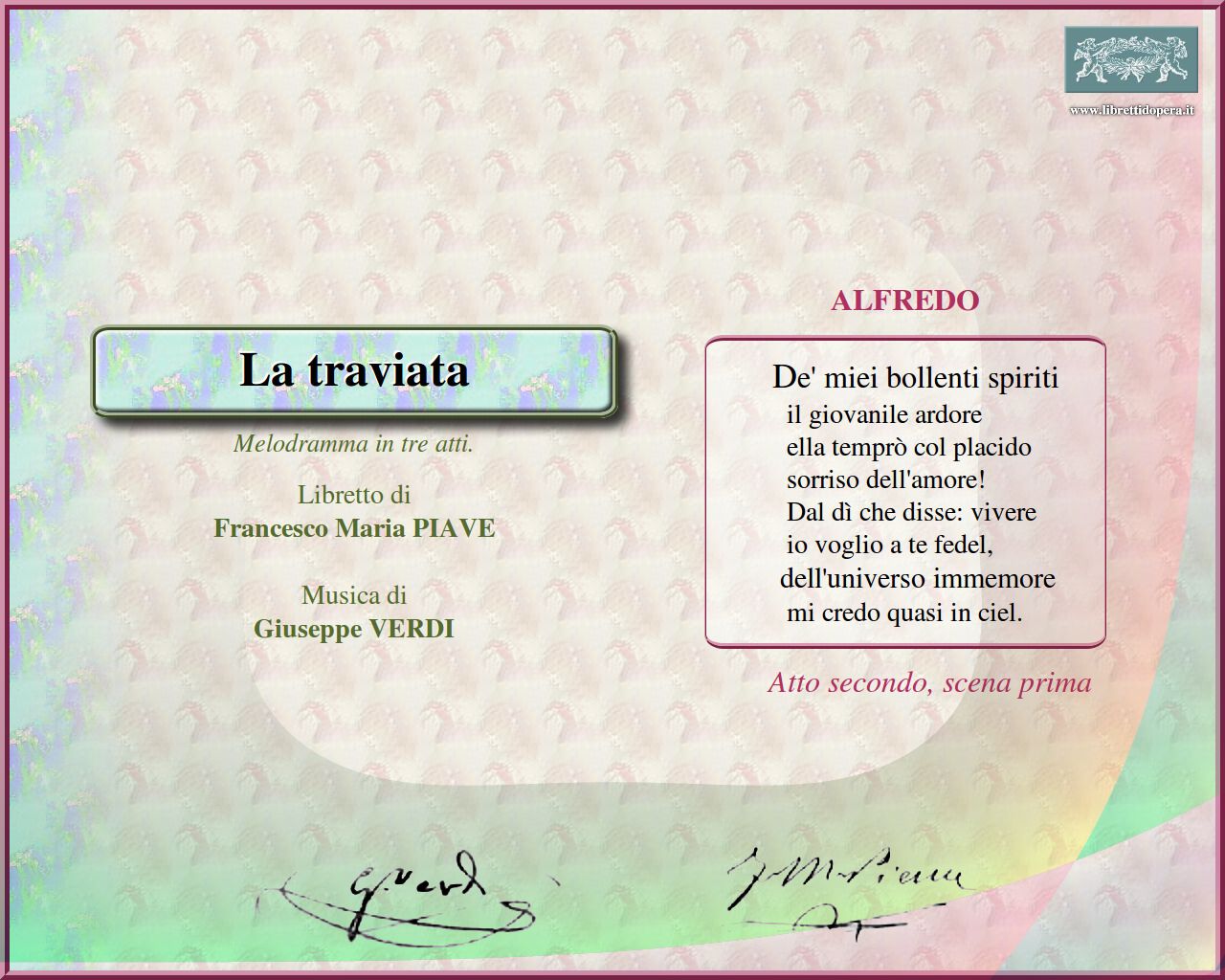 Libiam ne' lieti calici Ah, forse è lui che l'anima De' miei bollenti spiriti Pura siccome un angelo Noi siamo zingarelle Addio, del passato bei sogni ridenti