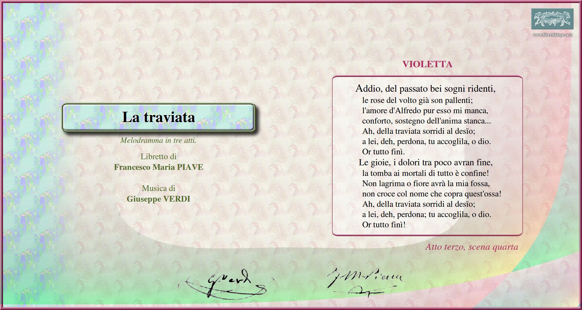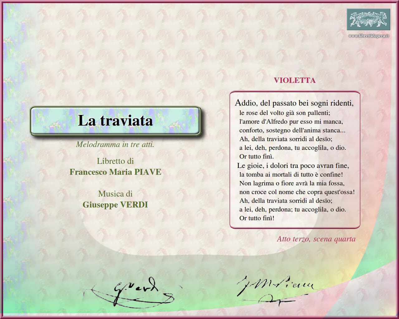 Libiam ne' lieti calici Ah, forse è lui che l'anima De' miei bollenti spiriti Pura siccome un angelo Noi siamo zingarelle Addio, del passato bei sogni ridenti