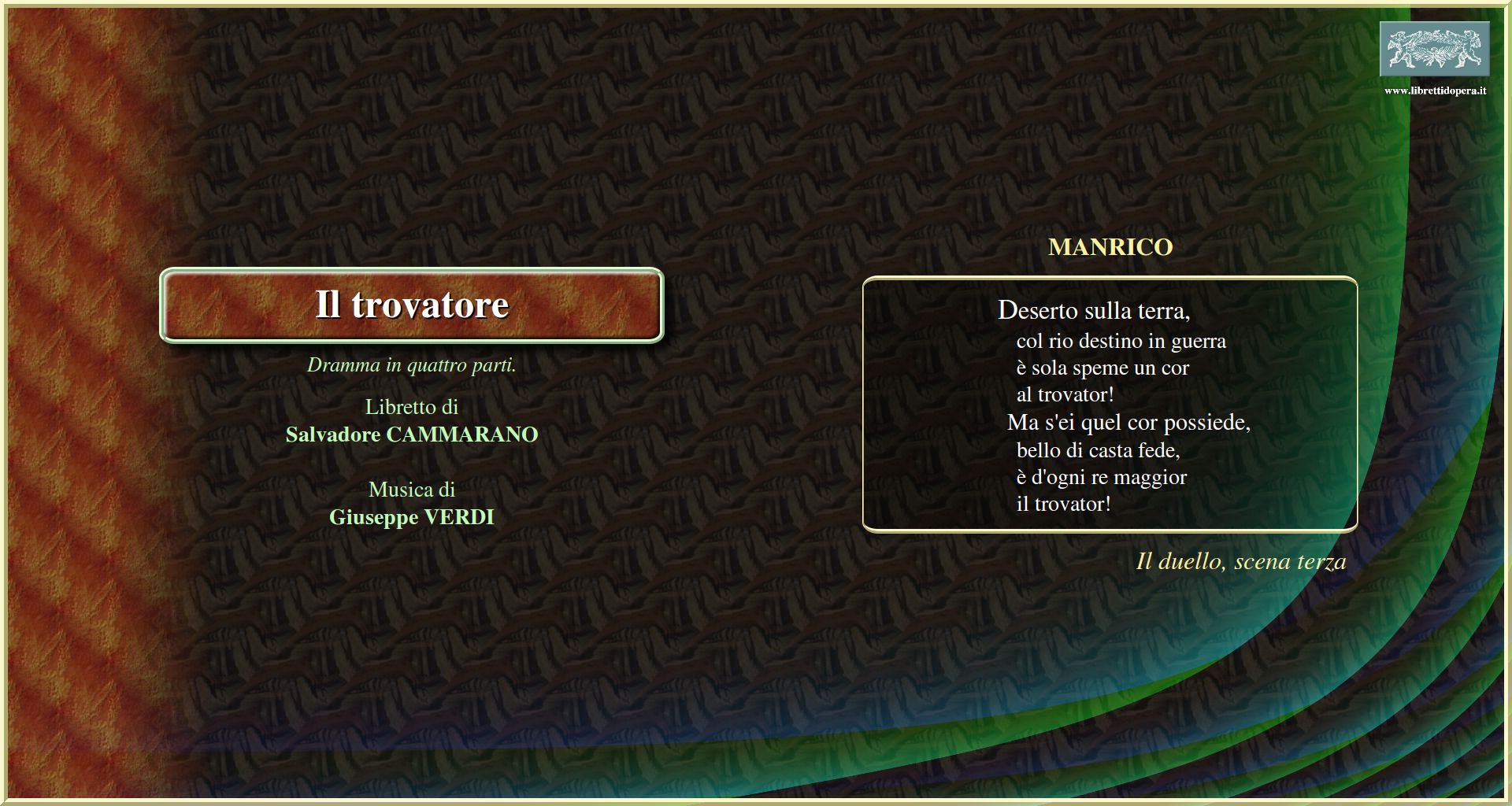Di tale amor che dirsi Tacea la notte placida Deserto sulla terra Di geloso amor sprezzato Stride la vampa! la folla indomita Vedi! Le fosche notturne spoglie Il balen del suo sorriso Squilli, echeggi la tromba guerriera Giorni poveri vivea Di quella pira... l'orrendo foco D'amor sull'ali rosee