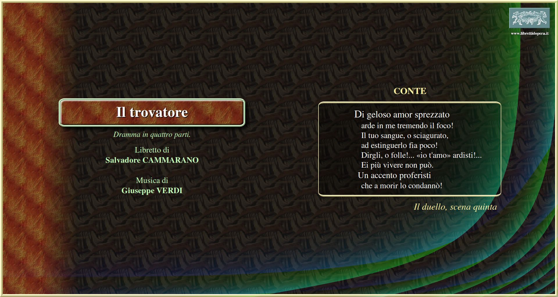 Di tale amor che dirsi Tacea la notte placida Deserto sulla terra Di geloso amor sprezzato Stride la vampa! la folla indomita Vedi! Le fosche notturne spoglie Il balen del suo sorriso Squilli, echeggi la tromba guerriera Giorni poveri vivea Di quella pira... l'orrendo foco D'amor sull'ali rosee