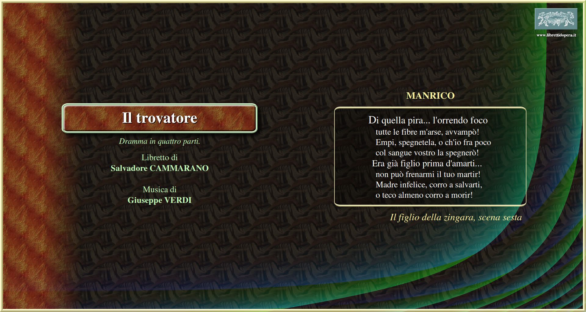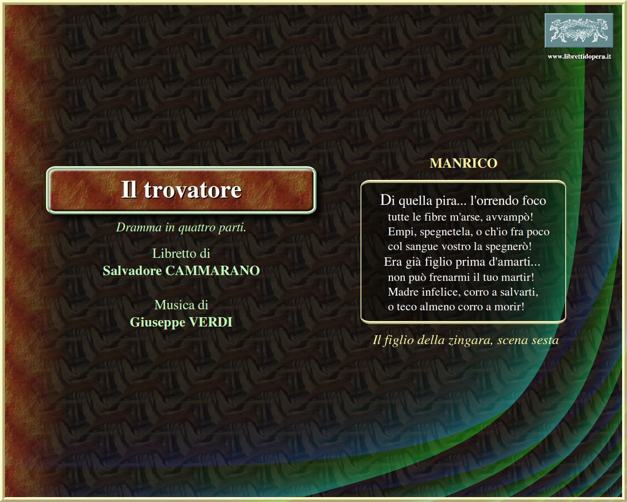 Di tale amor che dirsi Tacea la notte placida Deserto sulla terra Di geloso amor sprezzato Stride la vampa! la folla indomita Vedi! Le fosche notturne spoglie Il balen del suo sorriso Squilli, echeggi la tromba guerriera Giorni poveri vivea Di quella pira... l'orrendo foco D'amor sull'ali rosee
