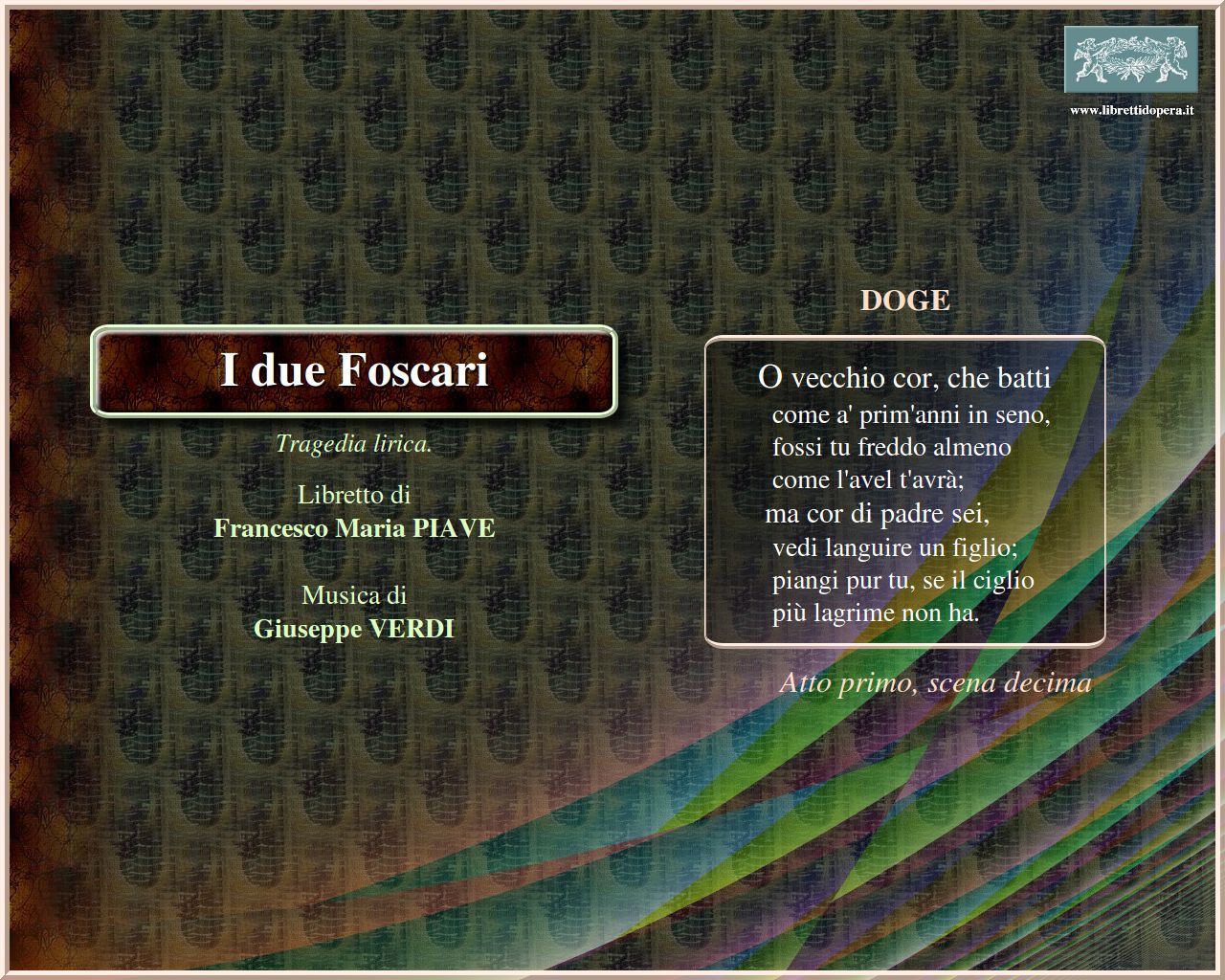 ⚫ […] l’opera possiede un carattere intimo e raccolto che anticipa Luisa Miller e un’inventiva formale che, più che altrove, si allontana dalle consuetudini: con il duetto Lucrezia-Foscari che conclude il primo atto (“Tu pur lo sai che giudice”), Verdi inaugurò quel duetto in più sezioni, obbediente alle regole formali del pezzo chiuso e al tempo stesso capace di assicurare lo svolgersi dell’azione drammatica, che avrebbe trovato la sua più completa realizzazione nella grande scena Violetta-Germont nel secondo atto della Traviata; I due Foscari è inoltre la prima opera nella quale Verdi rinunciò alla ‘stretta’ nei concertati, ritornandovi solo saltuariamente in seguito.
