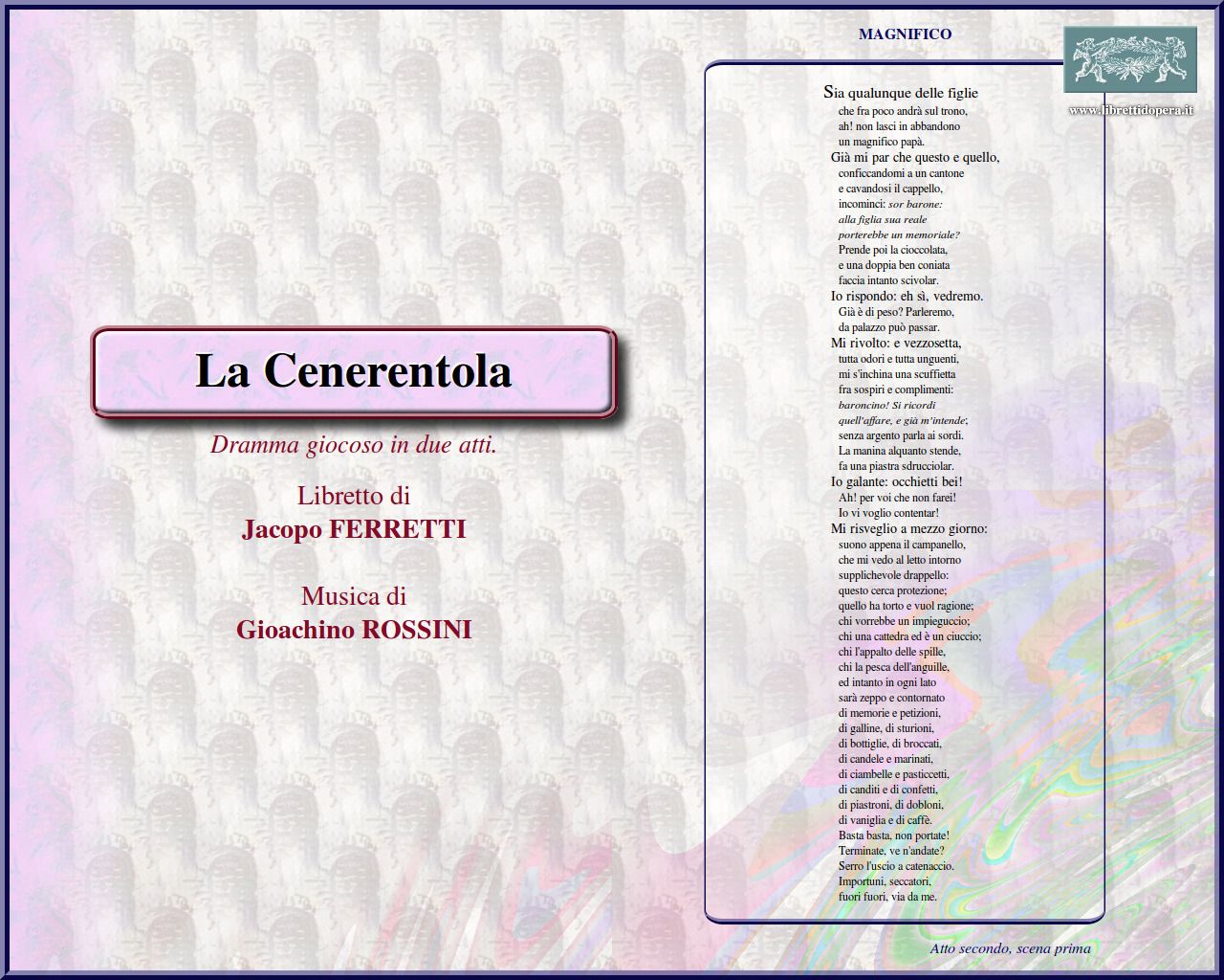 ⚫ Le trasformazioni e il riscatto sociale dell’innocente fanciulla sono […] argomento, pur sotto forme e varianti diverse, anche di racconti greci, egizi e cinesi, nonché dell’altrettanto celebre versione dei fratelli Grimm. È noto come Rossini e Ferretti abbiano eliminato dal racconto qualsiasi implicazione magica e fiabesca: forse la dimensione del meraviglioso non piaceva al pubblico romano dell’epoca, o forse Rossini non la sentiva, in quel momento, congeniale alla sua ispirazione. Di fatto nel libretto del Ferretti non appare il fondamentale personaggio della fata, né l’incantesimo che permette a Cenerentola di presentarsi al ballo magnificamente vestita.