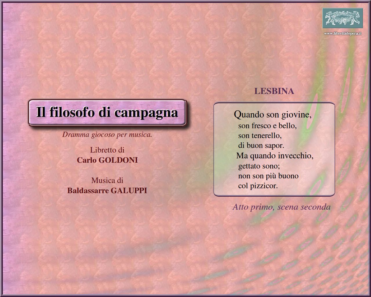 ⚫ Rappresentato (ma col titolo, a quanto si suppone, di Il filosofo in villa) al Teatro Formagliari di Bologna nell'estate 1754, Il filosofo di campagna ebbe la sua vera consacrazione al successo quando il 26 ottobre dello stesso anno inaugurò, a Venezia, la stagione autunnale dell'opera buffa al San Samuele. Senza raggiungere i fasti eccezionali dell'altrettanto goldoniana Buona figliola musicata da Piccinni, Il filosofo di campgna, per la sua quasi trentennale permanenza nei favori di numerosi pubblici europei, è fra le opere che si pongono alle origini del moderno istituto del «repertorio». Nella sua essenza musicale, esso appare un prototipo del nuovo stile operistico della seconda metà del Settecento, importante nella direzione verso Mozart.