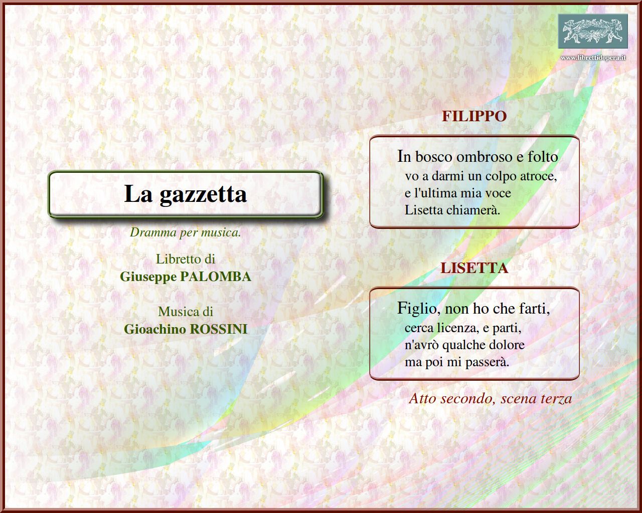 ⚫ Gaetano Rossi aveva confezionato, sulla base del Matrimonio per concorso (1763) di Goldoni, un libretto destinato al compositore Giuseppe Mosca, L’avviso al pubblico, andato in scena al Teatro alla Scala nel 1814. A questo testo si rifece Palomba quando fu incaricato di fornirne uno comico a Rossini. Questi, reduce dalla prima rappresentazione del Barbiere di Siviglia a Roma, stava concertando il Tancredi per il San Carlo. Né il libretto, che venne trovato inverosimile e spiacevolmente carico di trivialità, né la partitura, scritta senza dubbio frettolosamente e ‘rubando’ con pochi scrupoli da lavori precedenti, riuscirono troppo graditi al pubblico partenopeo.