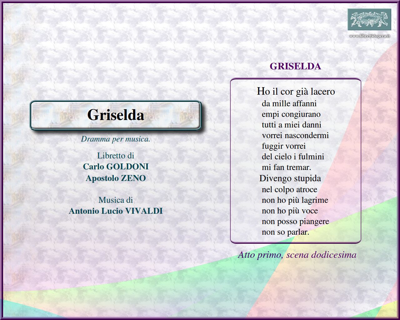 ⚫ La parte di Griselda venne sostenuta da Anna Girò, la cui carriera fu strettamente legata al nome di Vivaldi […]. Risulta evidente che le arie della protagonista risentono in misura notevole -come testimonia il resoconto di Goldoni- delle caratteristiche vocali della Girò: sono pezzi drammatici, con frequenti appelli a un interlocutore (il pubblico in sala o un collega in scena). Fondamentale è l’aria “Ho il cor già lacero”, in cui la frenesia incontenibile dell’accompagnamento orchestrale mima il delirio della donna disperata, che rispecchia l’efficacia del testo con frasi lacerate, urlate o spezzate in singhiozzi di dolore: «Divengo stupida nel colpo atroce, non ho più lagrime, non ho più voce; non posso piangere, non so parlar».