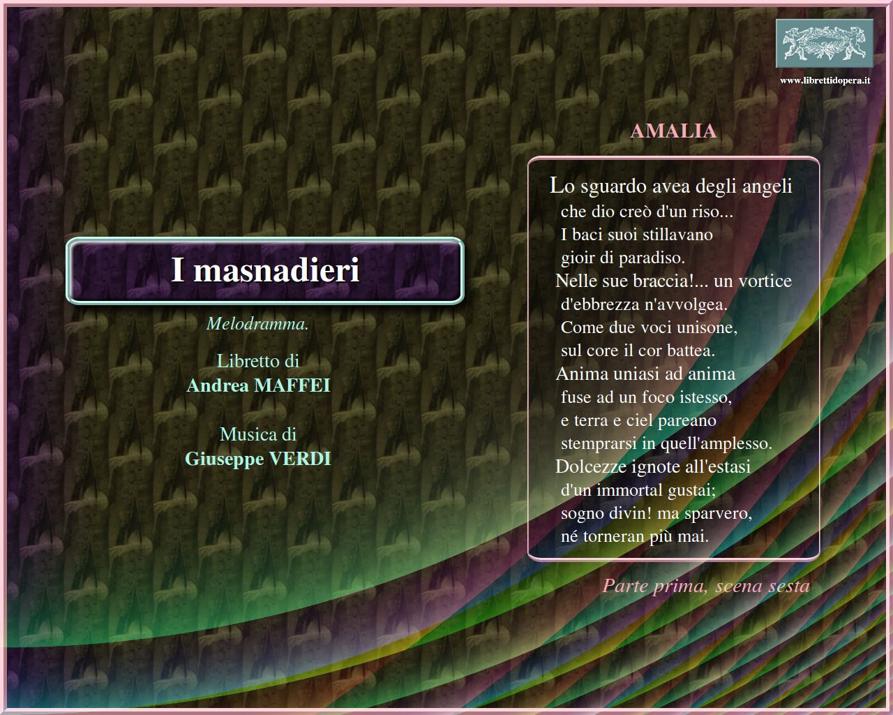 ⚫ […] il libretto di Maffei, pur pregevolissimo dal punto di vista letterario, manca di quell’unità drammatica di cui Verdi aveva assoluto bisogno per dare il meglio di sé.