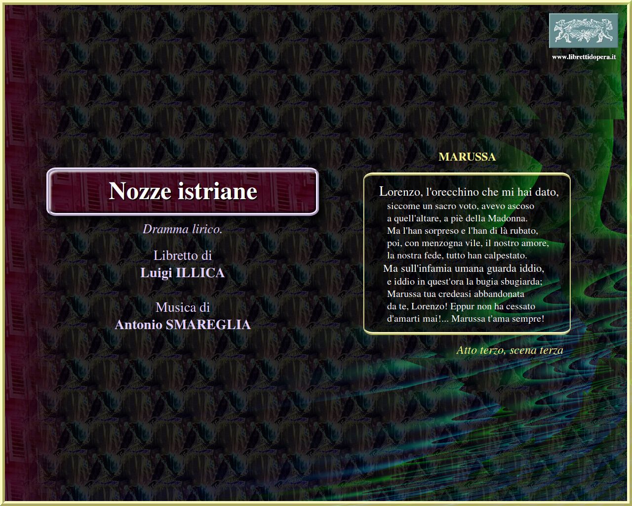 ⚫ Con un soggetto di amore e gelosia con duello finale, che lo rende così simile a Cavalleria rusticana, Smareglia riesce a non cedere alla retorica e a facili effetti drammatici. La vicenda è narrata in maniera essenziale, con una particolare raffinatezza timbrica e pagine d’effetto, come il temporale iniziale che ben delinea, con qualche debito al Beethoven della Pastorale , una situazione insieme atmosferica e psicologica; ma non dimentica neppure il colore locale, avvalendosi di stornelli istriani e di una ‘villotta’.