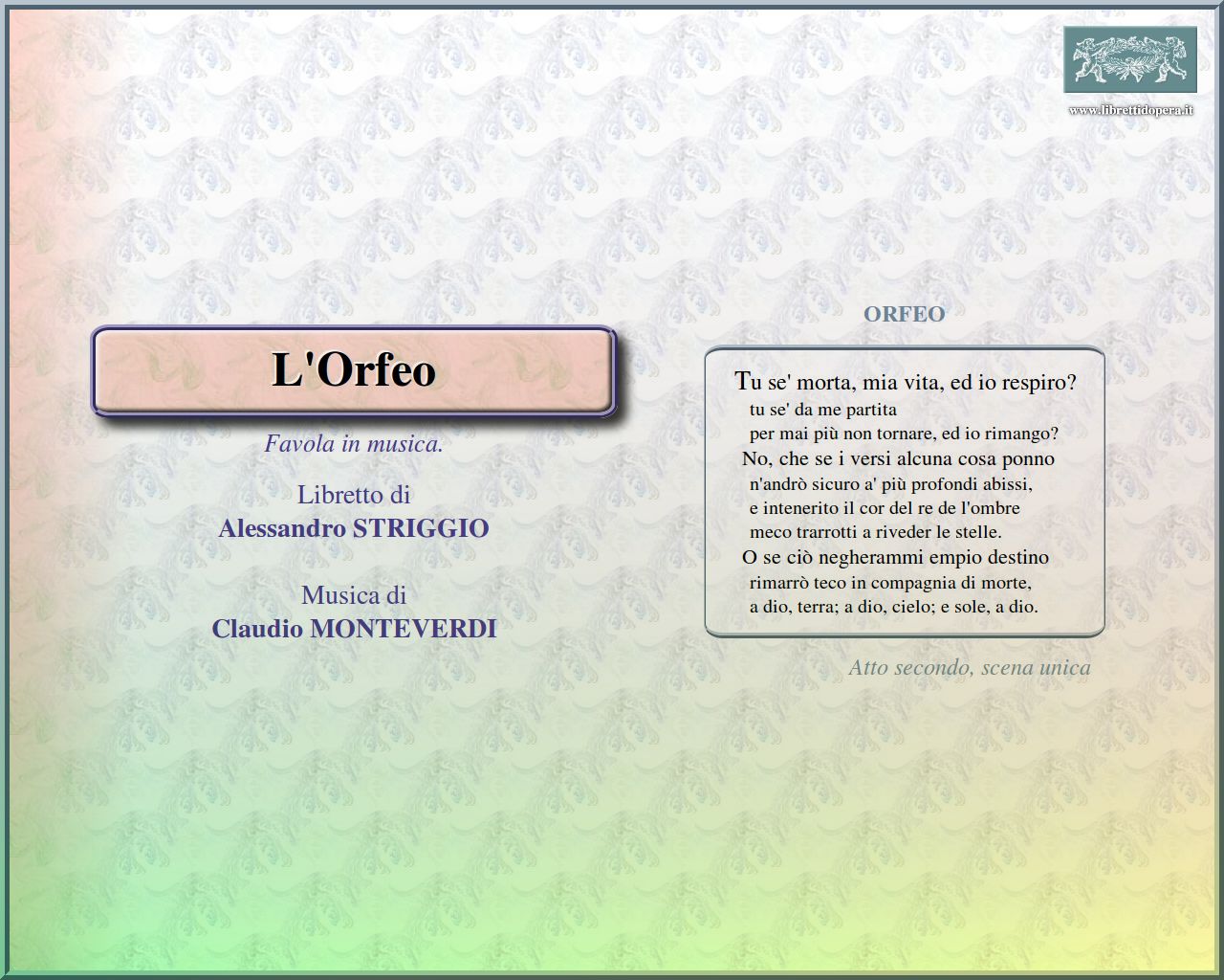 ⚫ Il soggetto sceneggiato da Striggio era il medesimo già impiegato pochi anni prima per una di quelle recite fiorentine del 1600 di cui si è detto: precisamente, per L’Euridice di Ottavio Rinuccini posta in musica da Jacopo Peri. Per quanto di ambiente boschereccio e non privo di rimandi ai modelli di teatro pastorale di Tasso (Aminta) e Guarini (Il pastor fido), rispetto al lavoro di Rinuccini Striggio dà al suo testo una maggior patina tragica: lo divide nei regolari cinque atti chiusi da cori gnomici, lo conforma almeno alle unità d’azione e di tempo anche se non di luogo. Gli imprime poi un taglio più drammatico di Rinuccini: alcune azioni e decisioni del protagonista sono prese in tempo reale davanti agli occhi degli spettatori, e non solo raccontate; all’interno degli atti non mancano grandi strutture, allestite per far risaltare le situazioni sceniche (ad esempio, nel primo il tableau con al centro la coppia Orfeo-Euridice; nel secondo i lieti canti strofici di Orfeo e dei pastori, di contro al successivo ‘parlato’ della messaggera con la ferale notizia della morte di Euridice).
