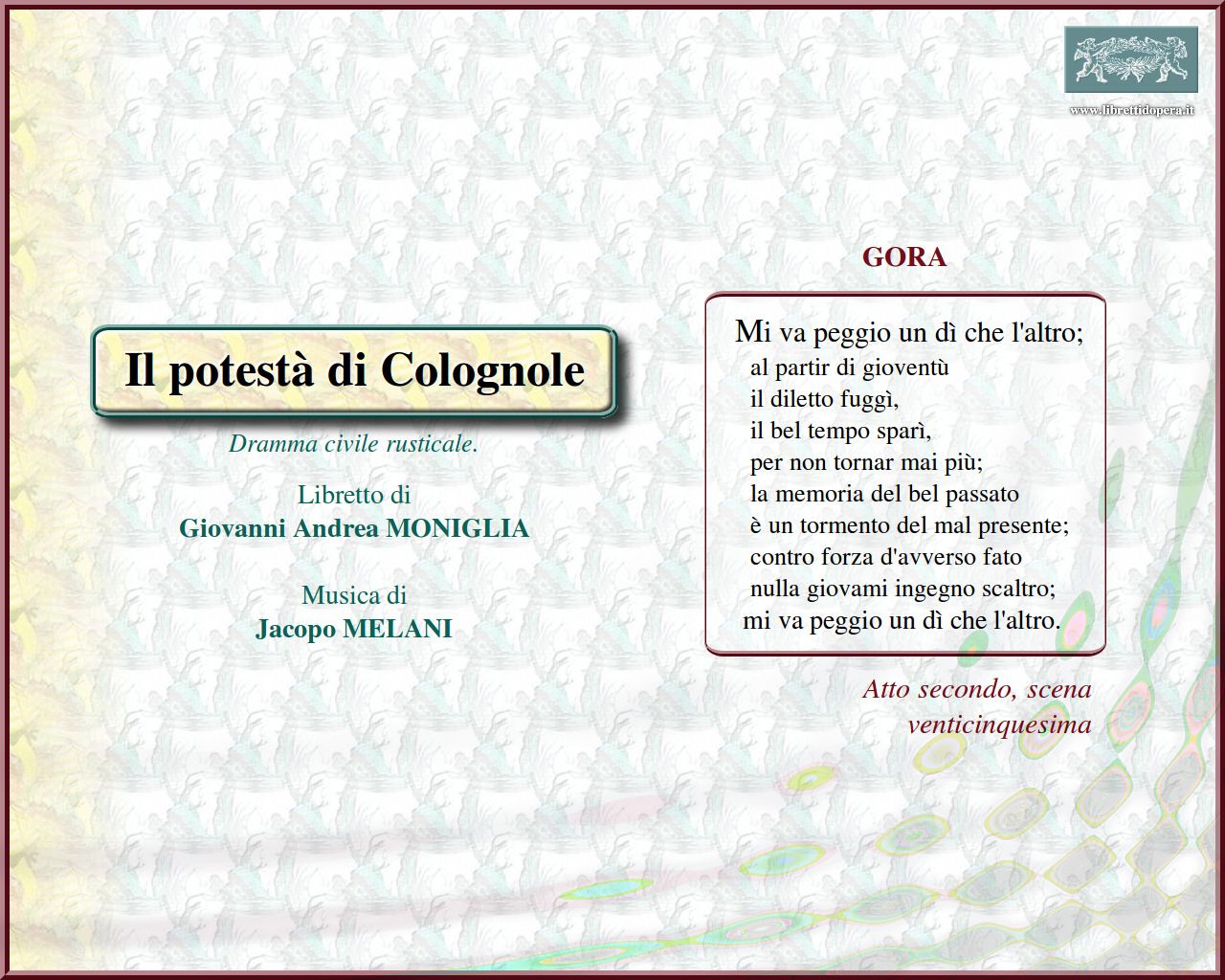 ⚫ Gli esordi operistici di Jacopo Melani, primo di sette fratelli tutti più o meno legati al mondo del teatro musicale, sono patrocinati dalla casa de’ Medici. Protetto dal principe Mattias fu subito coinvolto in quell’esperienza affascinante, ma breve ed economicamente fallimentare che fu il teatro di via della Pergola (1657-1661), travolto alla fine dalle spese per quella ‘opera-kolossal’ che fu L’Ercole in Tebe, sempre con musica di Melani. […] Il teatro, da inaugurarsi già nel 1654 con l’Ipermestra di Cavalli (allestita solo nel 1658), attese la sua apertura fino al carnevale del ’57 in cui fu rappresentato Il potestà di Colognole. Sarebbe stata la prima di una serie di opere ‘civili e rusticali’ affidate a Melani e a Giovanni Moniglia, librettista onnipresente negli spettacoli della Pergola, ma gli allestimenti si ridussero a quattro in tutto (delle altre si è però perduta la musica).