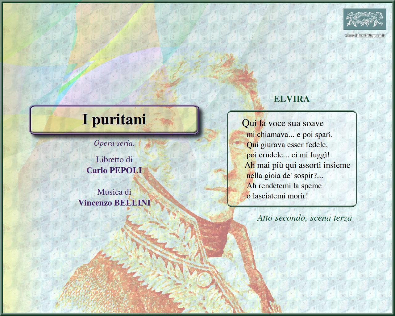 ⚫ [Non vengono compromesse] le peculiari qualità belliniane, in primo luogo la cura esemplare della melodia. I puritani fanno il più ampio sfoggio di idee melodiche felici, di momenti improntati a un lirismo espansivo, tipicamente italiano. Numerose sono le melodie memorabili: ad esempio l’effusione di “A te, o cara, amor talora”, con cui si presenta Arturo (formalmente il brano appartiene a un genere ibrido, che sta fra l’aria e il pezzo d’insieme); o la melodia dalle ampie arcate “Credeasi, misera” nel concertato della terza parte, espressiva e di grande respiro; o ancora il cantabile di Elvira che vaga, mesta e folle, per le stanze del castello (“Qui la voce sua soave”), con la frammentazione della linea vocale tipica di una mente sconvolta, prima di sfociare nella virtuosistica cabaletta (“Vien, diletto, è in ciel la luna”) che produce, con le sue acrobatiche fioriture, un effetto quasi spettrale.