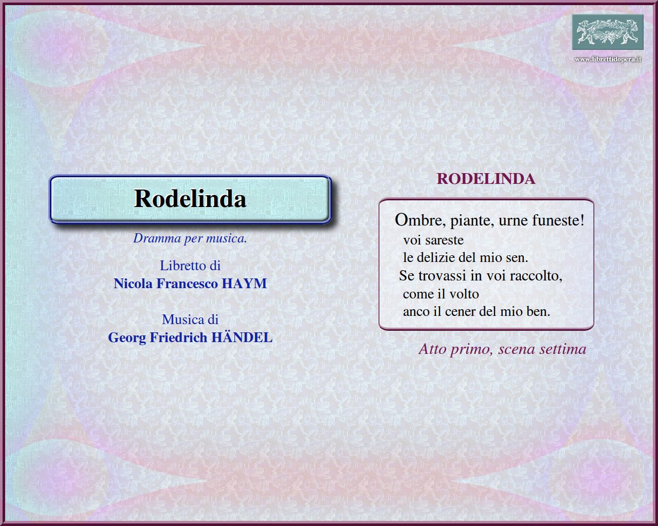 ⚫ Rodelinda emerge su tutti gli altri personaggi e risulta una delle figure più riuscite delle opere di Händel; nella varietà delle nove arie a lei affidate emergono i suoi diversi sentimenti: assoluta fedeltà allo sposo, fermo rifiuto opposto alla corte di Grimoaldo, odio nei confronti dell’usurpatore e del suo perfido consigliere. Memorabili sono due arie in cui esprime il dolore per la perdita del marito, “Ho perduto il caro sposo” e “Ombre, piante, urne funeste”; quest’ultima si ricollega alla tipologia del lamento per l’impiego del flauto traverso.