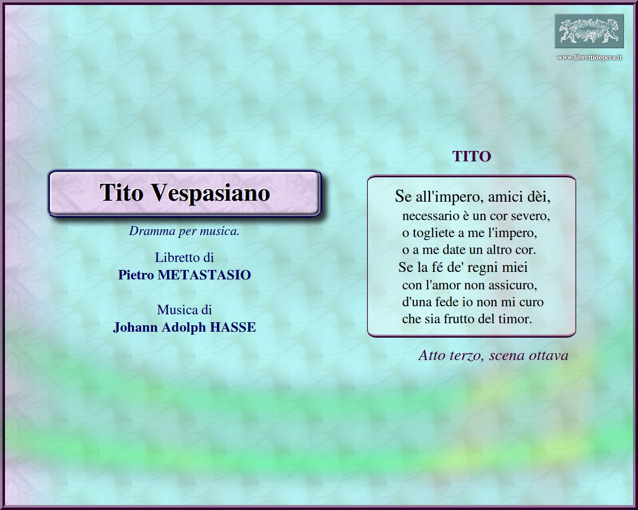 ⚫ Scritto originariamente per un teatro italiano, il Tito Vespasiano (così era stato modificato il titolo di Metastasio) fu rivisto da Hasse quando venne presentato tre anni più tardi alla corte di Dresda, dove il compositore ricopriva il titolo di Maestro di cappella. […] Venti anni più tardi, quando giunse da Napoli la commissione per quattro opere da rappresentarsi nel giro di pochi mesi, il compositore ritornò al libretto metastasiano, confezionando una partitura completamente nuova e di grande importanza. Dieci pezzi furono composti per l’occasione, mentre un’altra decina di arie venne adattata da pagine già scritte per altre opere (L’Olimpiade, Ezio, Il re pastore). Più che nel senso di cambiamenti stilistici radicali, la revisione si mosse nella direzione di un miglioramento della prova precedente. Il risultato è una partitura che, come l’Achille in Sciro presentato due mesi prima, innalza il progetto dell’opera seria a una ricchezza espressiva e sontuosità di mezzi senza pari.
