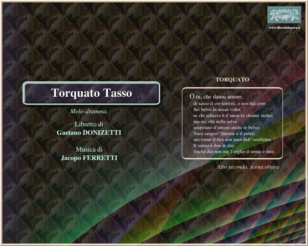 ⚫ Di particolare interesse sono le sezioni del libretto in cui si citano i versi originali del Tasso: «Talvolta mi è riuscito», informa Ferretti, «di far parlare Torquato con versi tolti qua e là dal suo bellissimo, e forse non abbastanza ammirato Canzoniere». Un libretto d’opera poteva quindi essere anche veicolo di altri testi, citati in ampie sequenze oppure inseriti a brevi frammenti. In molte opere del Seicento era presente un gusto «metaletterario», che coinvolgeva gli interessi di un pubblico di lettori-ascoltatori: ad esempio, in alcune opere romane su libretto di Giulio Rospigliosi, basate sui poemi di Ariosto e di Tasso. Come in quei casi, anche nel libretto di Ferretti l’opera diventa pretesto per condensare e declamare in musica, drammatizzandoli e contestualizzandoli fantasiosamente, i versi più famosi di un poeta, in una sorta di antologia personalizzata e celebrata sulla scena. Come in quei casi, anche nel libretto di Ferretti l’opera diventa pretesto per condensare e declamare in musica, drammatizzandoli e contestualizzandoli fantasiosamente, i versi più famosi di un poeta, in una sorta di antologia personalizzata e celebrata sulla scena.