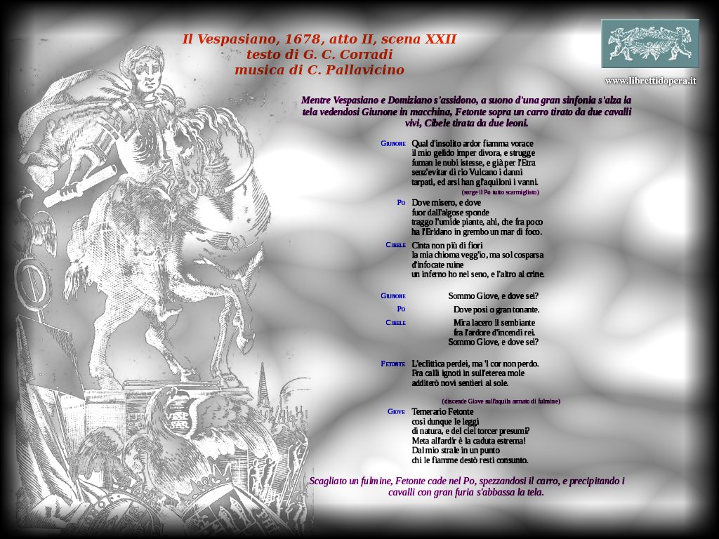 ⚫ Il primo lavoro che determinerà la fortuna di Carlo Pallavicino è Il Vespesiano, scritto per l’inaugurazione del nuovo sontuosissimo teatro dei fratelli Grimani, il terzo da loro aperto a Venezia. Il teatro, per ampiezza, decorazioni e qualità degli allestimenti, si vuole imporre fin dal suo esordio come luogo principe dell’arte lirica, e ci riuscirà egregiamente. Non stupisce perciò la scelta del soggetto, affidato a Giulio Cesare Corradi, tutto teso a sottolineare la straordinarietà del nuovo edificio: l’imperatore Tito Flavio Vespasiano fu infatti colui che fece erigere il Colosseo.