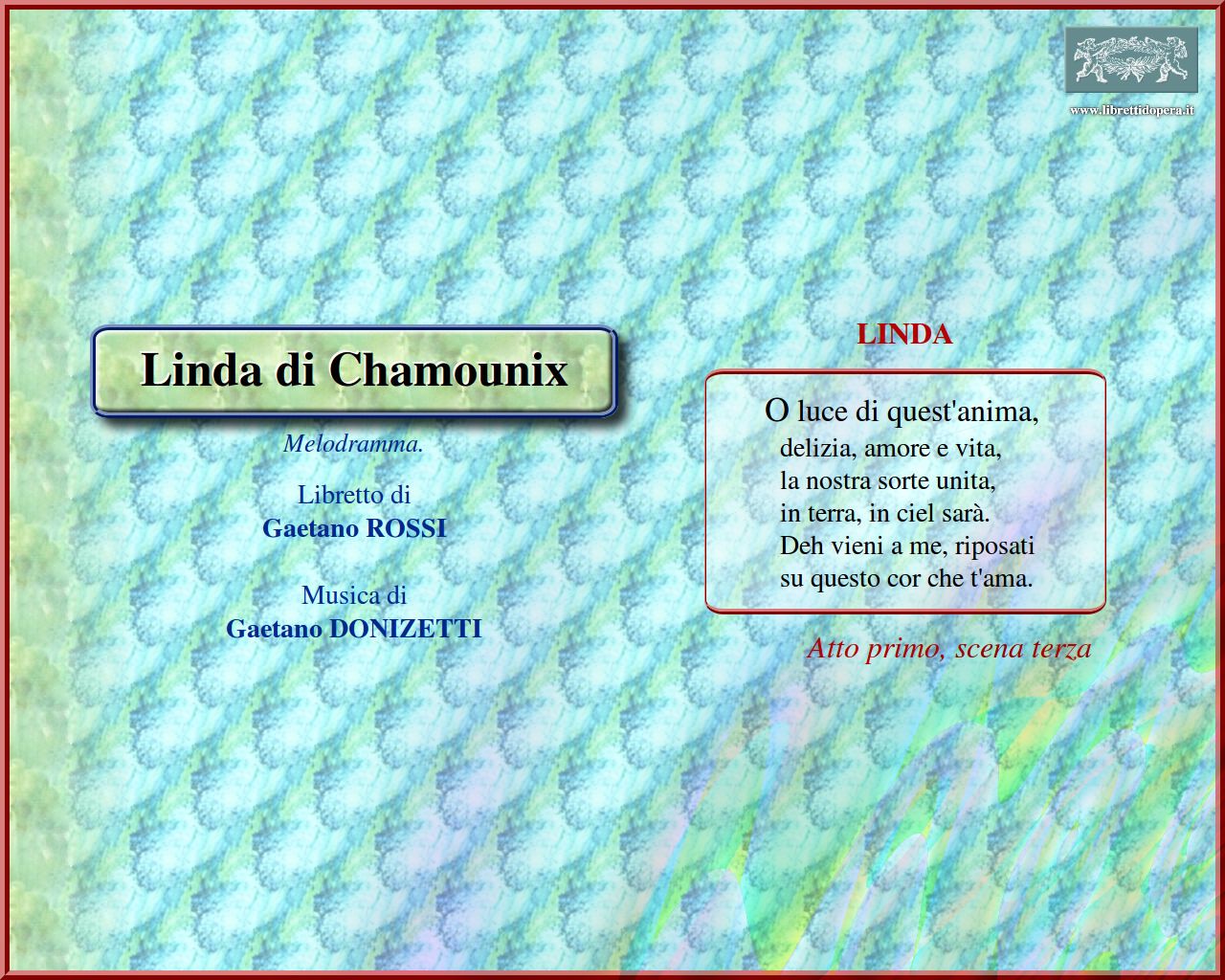 ⚫ Dopo la ‘prima’ italiana (Torino, Teatro Carignano, 24 agosto 1842), l’opera, ripresa a Parigi (Théâtre Italien, 17 novembre 1842) con Fanny Tacchinardi-Persiani nel ruolo della protagonista, si arricchì di un nuovo e fortunato brano, la tyrolienne “O luce di quest’anima”. Composta da Donizetti su versi propri (nell’edizione viennese Linda entrava in scena intonando un semplice recitativo), quest’aria divenne in breve la più famosa dell’opera.