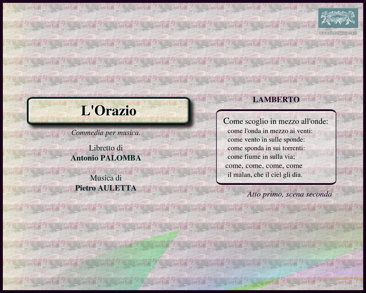 ⚫ L'estate seguente [1747, Milano n.d.r.] si ebbe invece, anonimo, il famoso Orazio originariamente di Auletta (Napoli, 1737), già applaudito in forma di pasticcio a Firenze e a Venezia; più tardi, nell'autunno 1759, esso giungerà anche a Pavia. […] Nel 1744 […] le seguivano […] e il celebre pasticcio Orazio, qui [a Genova n.d.r.] rappresentato sotto i nomi di Latilla e Pergolesi.