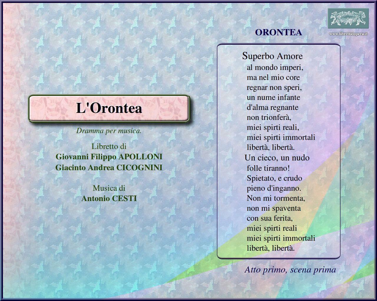 ⚫ Gran fama venne a Cesti fin dalla prima opera Orontea […]. Il merito, per generale consenso, va anche al libretto tagliato modernamente, con mano felice, da G. A. Cicognini, attento a ravvivare con intonazione di commedia, soffusa di caricaturale ironia (è lui stesso a dichiarare di «comporre per mero capriccio»), il togato dramma d'intrigo veneziano, mirando a una dilettosa pluralità di stili e fondendo la tradizione della commedia dell'arte con elementi del grande teatro barocco spagnolo in un intreccio a inedito sfondo psicologico con punte fiabesche.