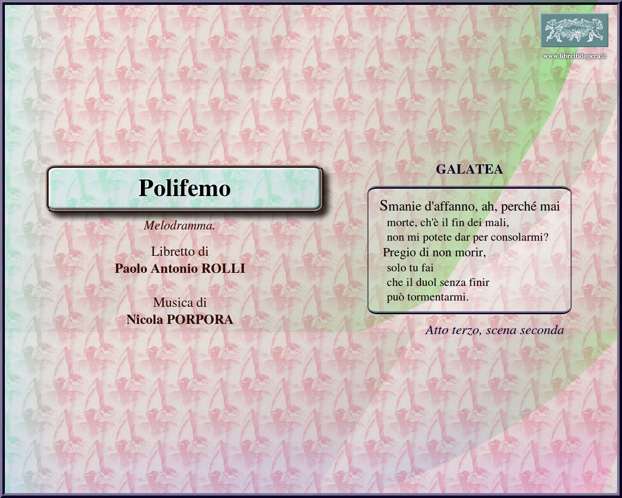 ⚫ Si avverte in Polifemo una maggiore cura nell'uso del recitativo, che va a tutto vantaggio dello spessore psicologico dei personaggi. Nelle pause d'azione scenica essi indugiano a considerare il proprio stato in brevi monologhi, fra i quali è notevole quello di Ulisse sull'infelicità della condizione umana paragonata all'inconsapevole felicità degli armenti, sorprendentemente simile ai versi del pastore errante leopardiano […]; o ancora, in versi non musicati dal Porpora, alla vivace descrizione dello stato amoroso da parte di Galatea […]. Sul coté musicale è frequente il ricorso del Porpora al recitativo accompagnato e all'arioso, marcato in due punti anche dal mutamento del metro (I, 4, 1-8, con le rime disposte a ottava; III, 2, 13-21, con quinari sdruccioli).