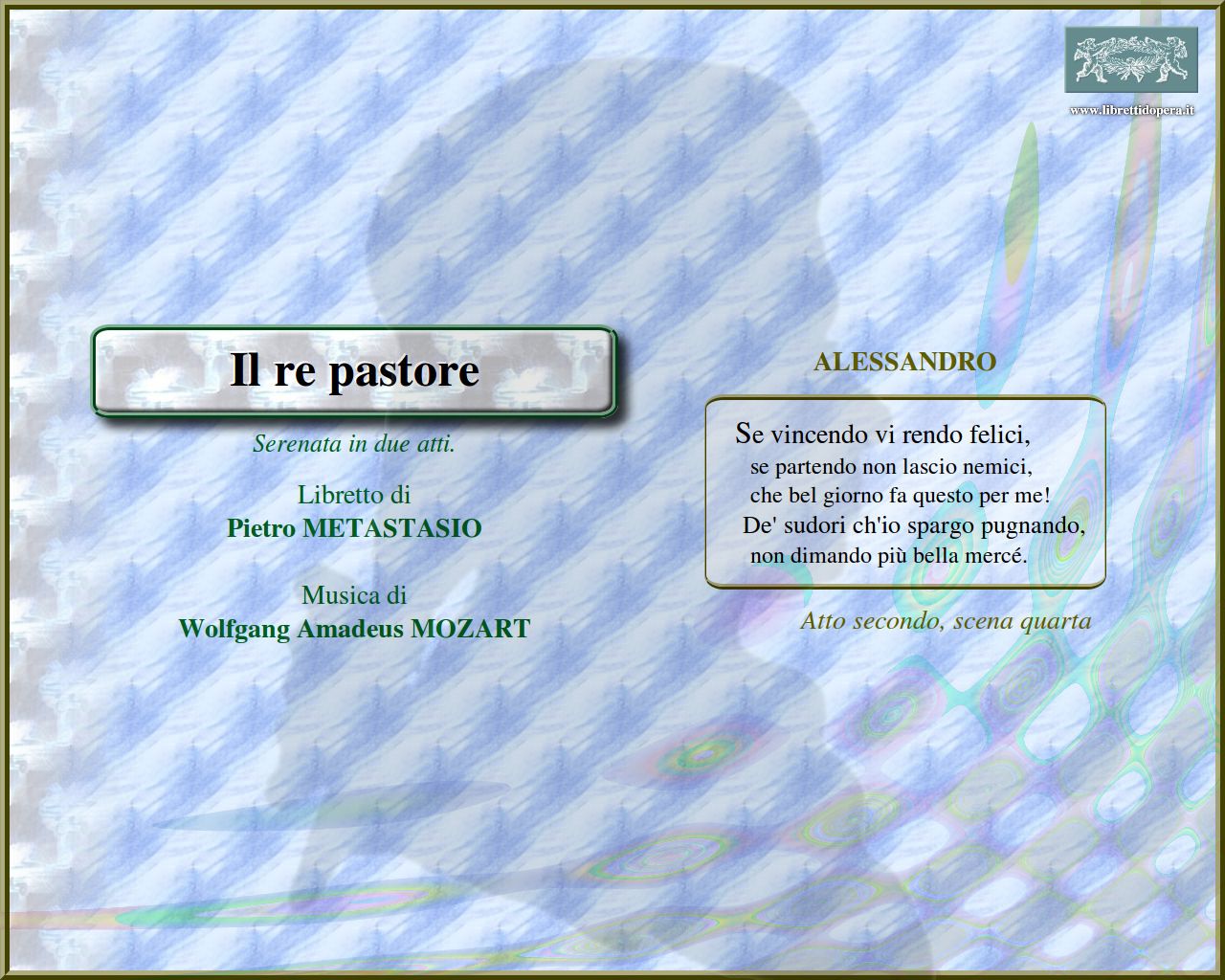 ⚫ Il re pastore fu scritto da Metastasio su incarico dell'imperatrice Maria Teresa e allestito nel 1751 da personalità della corte austriaca con la musica di Giuseppe Bonno, maestro della cappella reale. Sotto il profilo formale […] si trattava di un dramma per musica, ma sia per il contenuto sia per la scenografia era una festa teatrale, uno spettacolo appartenente al genere del dramma pastorale. […] Dall'alto della sua fama di drammaturgo e delle sue capacità letterarie, il Metastasio volle gettare uno sguardo illuminante su quell'Arcadia ideale che pur ereditata dall'antichità non era sfuggita a una reinterpretazione in chiave cristiana. […] Con tratti decisi e in versi che fluiscono con grazia, il Metastasio non descrisse il mondo com'era, ma come avrebbe dovuto essere: un mondo dove i conflitti si presentano come equivoci […] nati fra persone nobili d'animo e di sentimenti. […] Da un fatto accaduto all'epoca di Alessandro Magno e tramandato dagli storici (come al solito il Metastasio cita scrupolosamente le fonti), il poeta trasse l'exemplum dell'autentico sovrano-pastore, di colui ch'è per il suo regno un «buon pastore». Nel dramma, Alessandro lo dice prima del coro conclusivo, nell'opera di Mozart prima del finale: «Bella sorte d'un regno è il re pastore»