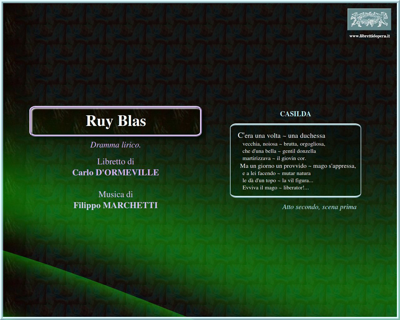 ⚫ La vena elegiaca di Marchetti connota i momenti di trasognata estasi, con una delicata scrittura orchestrale -prova ne sia il duetto amoroso “O dolce voluttà” (Donna Maria, Ruy Blas), perla della partitura- e infonde accenti di sincero pathos, come nella scena della morte del protagonista; sotto questo profilo Marchetti segna un punto di transizione verso la linea che sarà tracciata da Catalani e da Puccini.