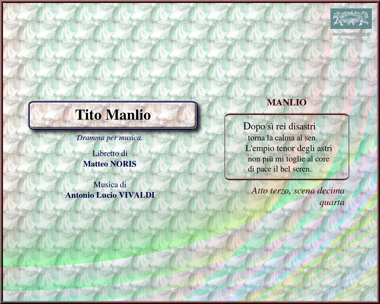 ⚫ Il libretto per Tito Manlio di Vivaldi, […] è opera di Matteo Noris […]. Talune sue caratteristiche sono tipiche dei libretti scritti prima della «riforma» di Apostolo Zeno e dei librettisti a lui legati, il cui effetto cominciò a farsi sentire dai primi anni del nuovo secolo. Si tratta di caratteristiche importanti, perché, in misura difficile oggi da immaginare, praticamente tutti i compositori dell'epoca, non escluso Händel, si assoggettavano di buon grado alle prescrizioni del librettista, né avevano modo di modificare o quanto meno di esercitare un controllo sul suo operato. Di conseguenza, molto di quanto noi oggi riferiamo all'invenzione musicale, deve la sua origine al pensiero del librettista più che a quello del compositore.