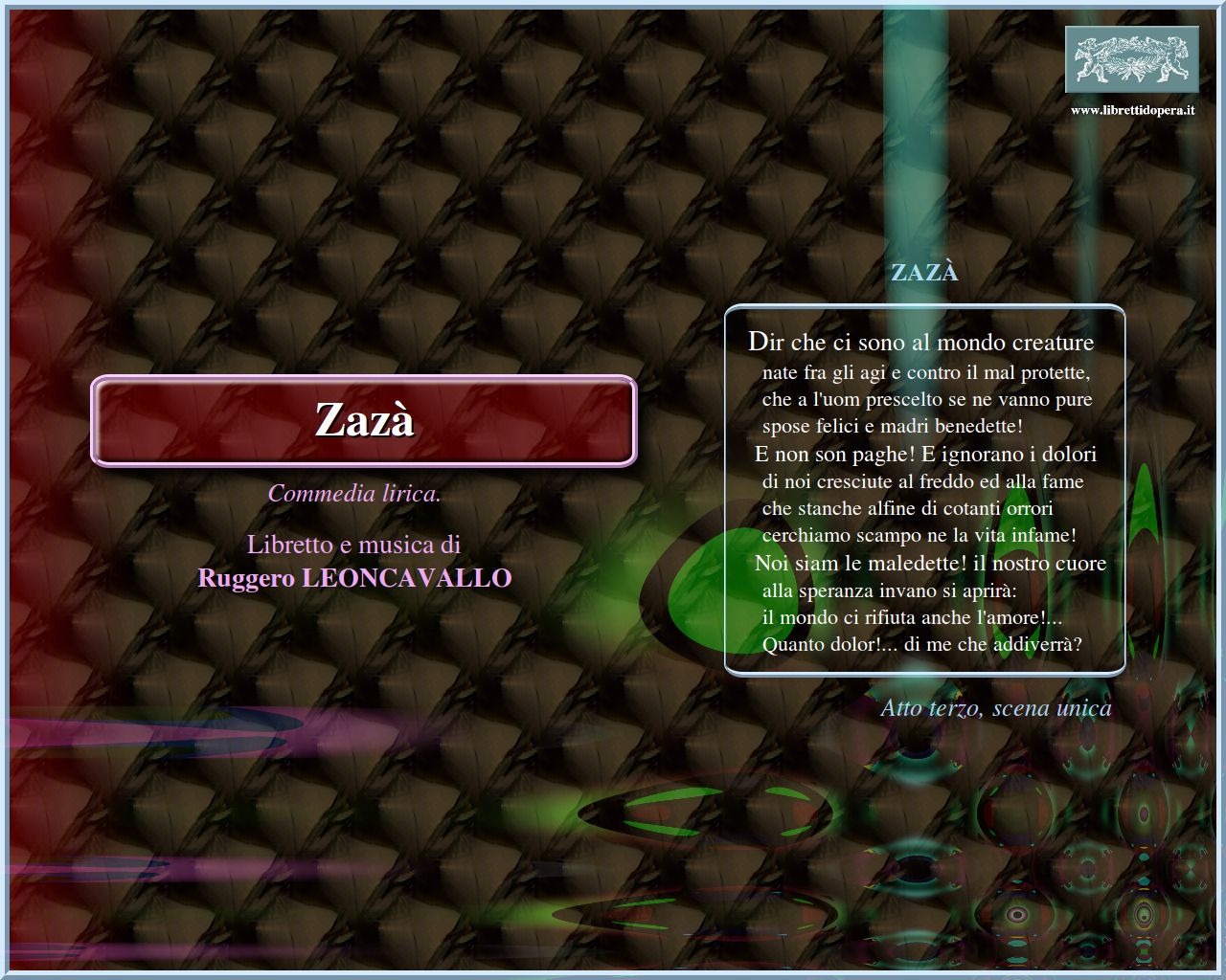 ⚫ Il mondo del teatro visto da dietro le quinte, il ruolo dell’attore costretto a recitare nonostante i propri problemi personali: sono temi che Leoncavallo aveva già sviscerato in Pagliacci, e che qui ritornano, seppure in un’ottica meno tragica. Ma al compositore piace mescolare le carte utilizzando temi da caffè-concerto, parodie rossiniane, romanze da salotto, stilemi operettistici. Tanti, forse troppi, sono i personaggi che affollano i camerini e il palcoscenico dell’Alcazar: su tutti domina la figura della protagonista, di cui l’opera delinea un vero e proprio ritratto psicologico. Con «energia disperata» (come prescriveva il compositore), Zazà nel terzo atto declama la sua disperazione e l’amara constatazione dell’impossibilità del suo amore: in stridente contrasto, per sottolineare ancora di più la distanza tra il suo mondo, quello del caffè-concerto, e quello di Milio, un salotto borghese, la piccola Totò suona al pianoforte un’Ave Maria di Cherubini.