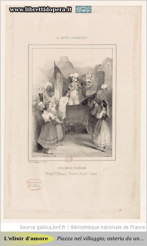 Piazza nel villaggio; osteria da un lato. Carro di Dulcamara. | ![]() |