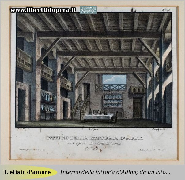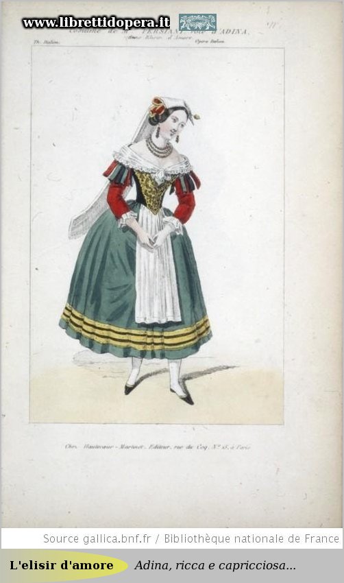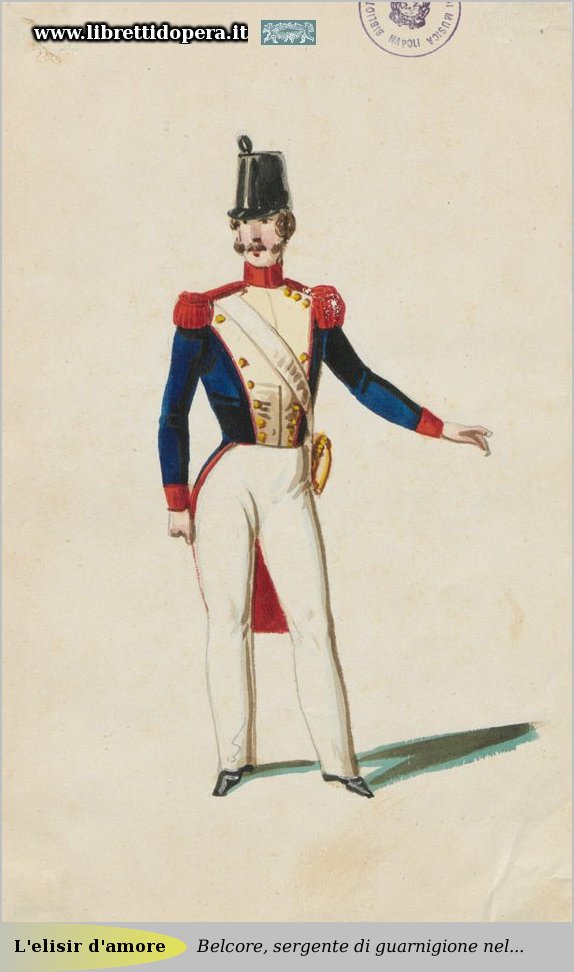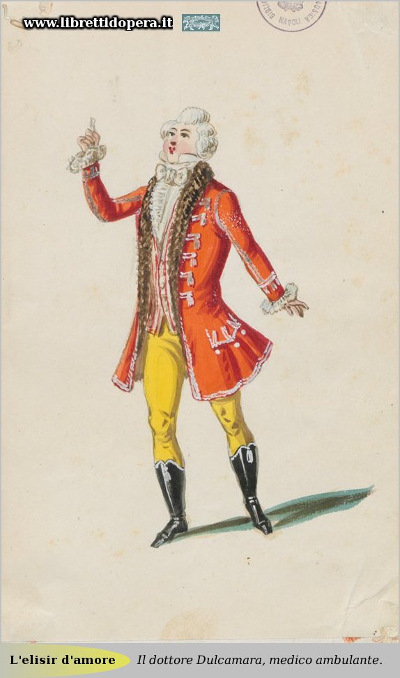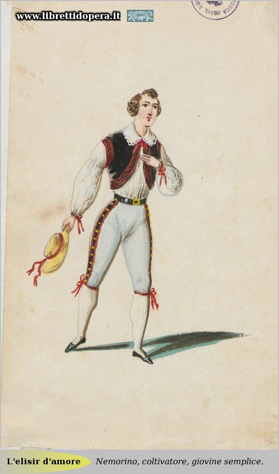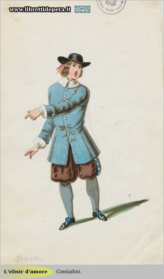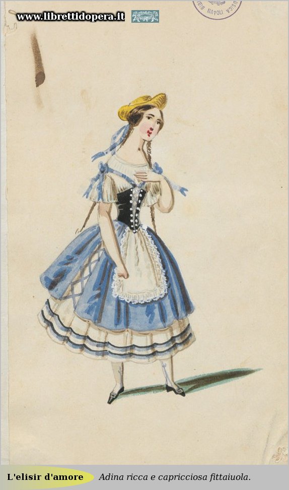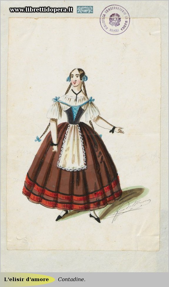• Figurini per la rappresentazione dell'Elisir d'amore al Teatro del Fondo di Napoli nell'anno 1854. Internet culturale, Biblioteca del Conservatorio di musica S. Pietro a Majella. |