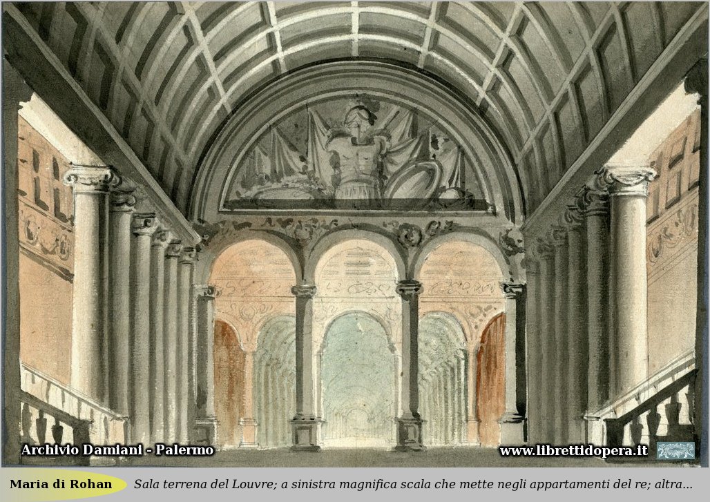Sala terrena del Louvre; a sinistra magnifica scala che mette negli appartamenti del re; altra simile a dritta, conducente a quelli della regina; nel fondo intercolumnio, attraversato da seriche, effigiate cortine. | ![]() |