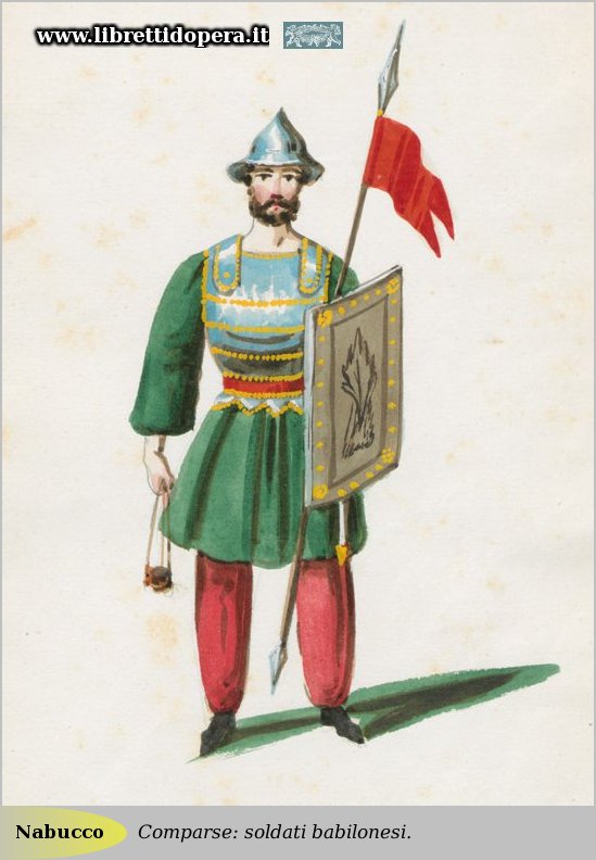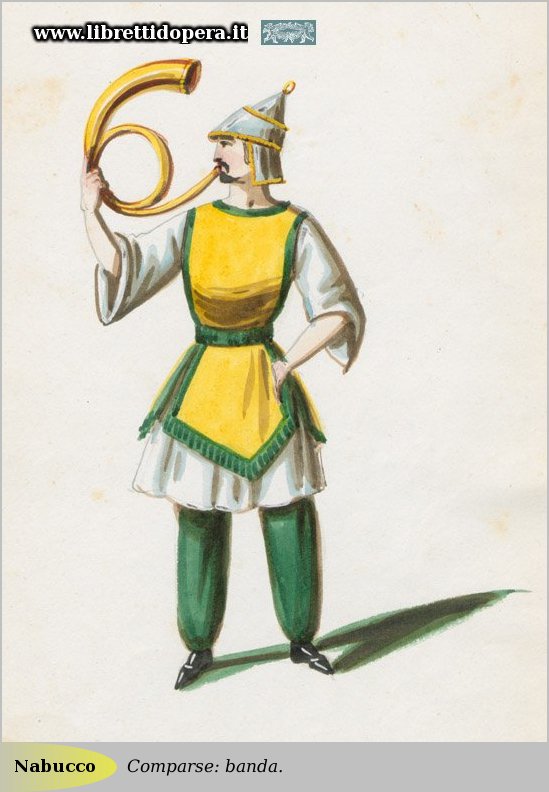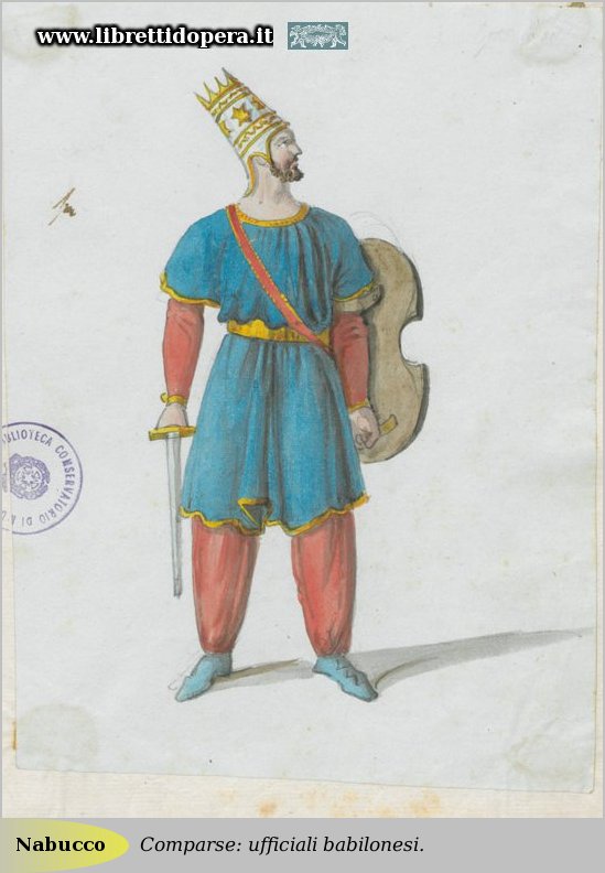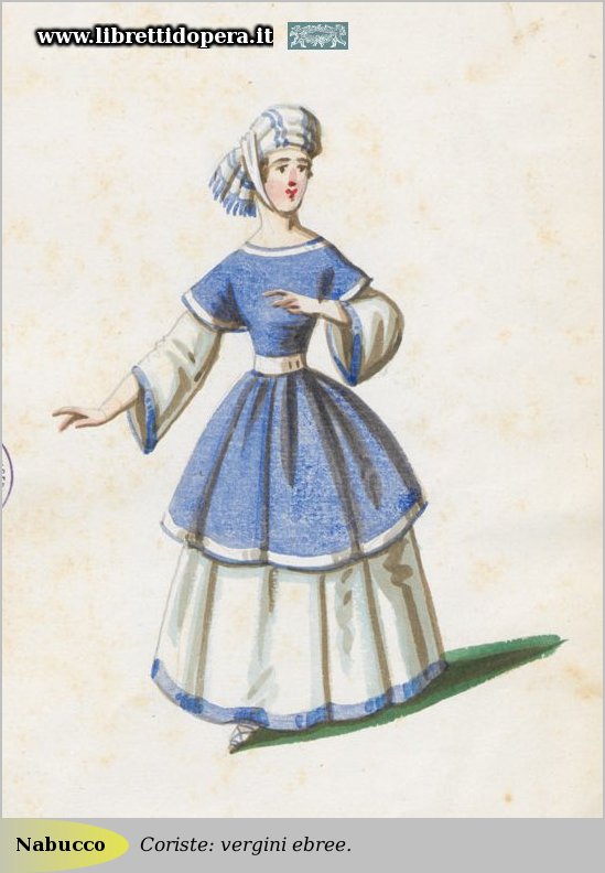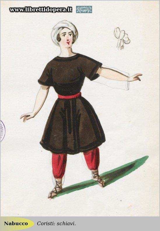 • Figurini per la rappresentazione al teatro S. Carlo, Napoli, 1848 Internet culturale, Biblioteca del Conservatorio di musica S. Pietro a Majella. |
