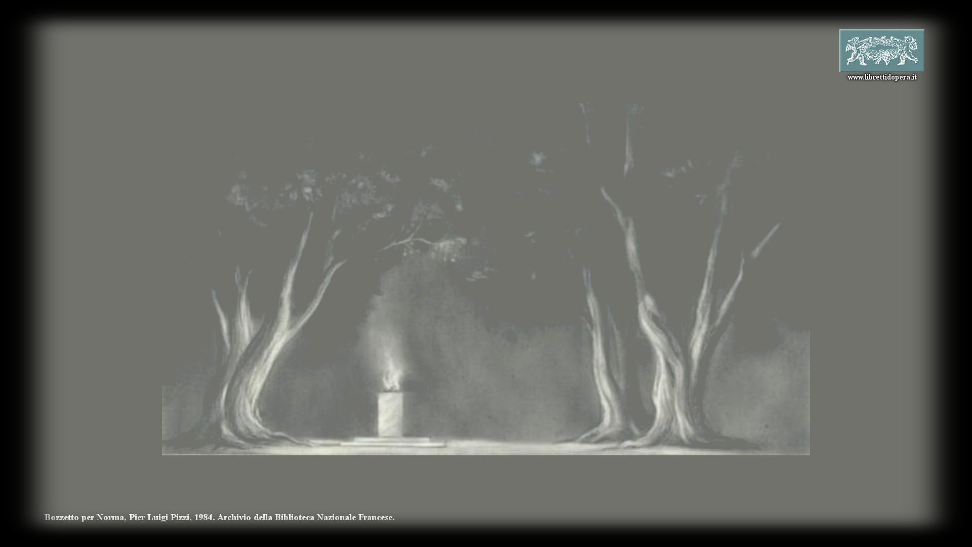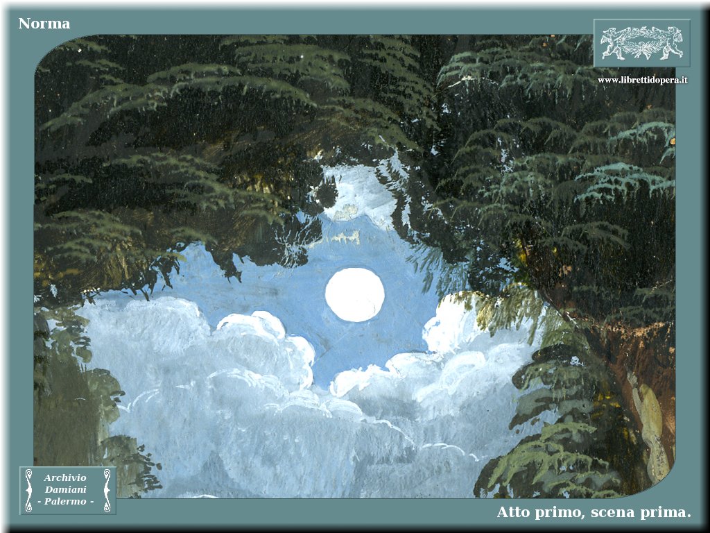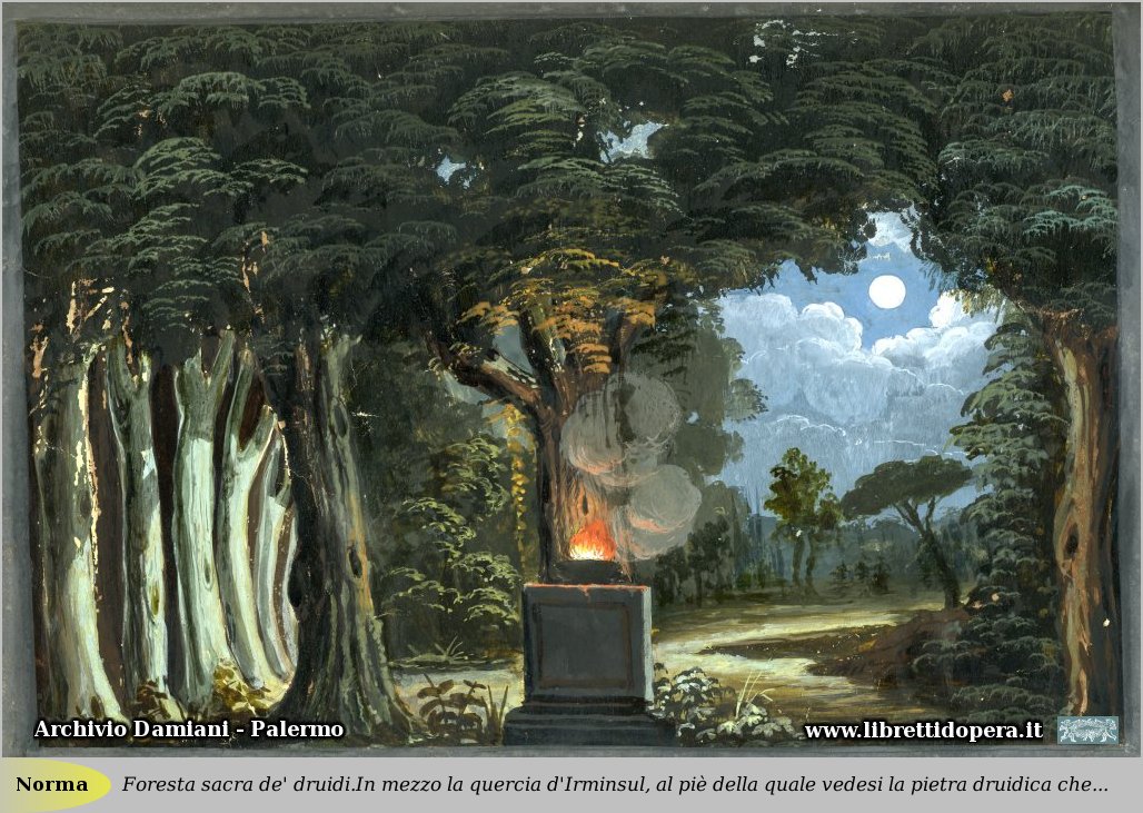 Foresta sacra de' druidi. In mezzo la quercia d'Irminsul, al piè della quale vedesi la pietra druidica che serve d'altare. Colli in distanza sparsi di selve. Notte. | ![]() |