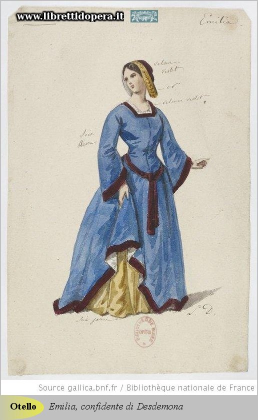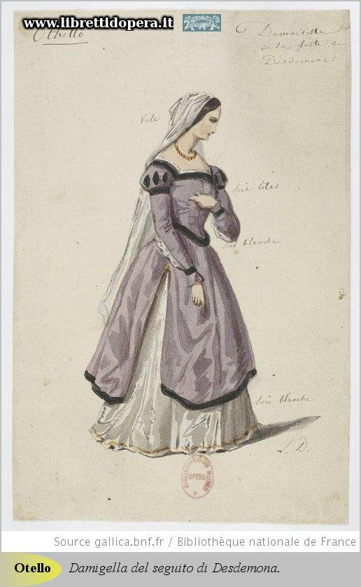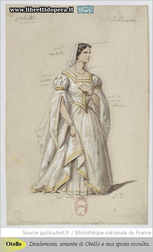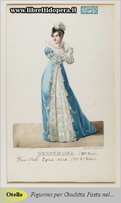 Figurino per Giuditta Pasta nel ruolo di Desdemona, amante di Otello e sua sposa occulta. | ![]() |
