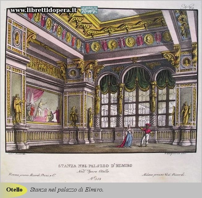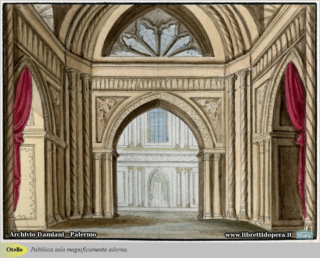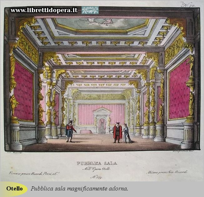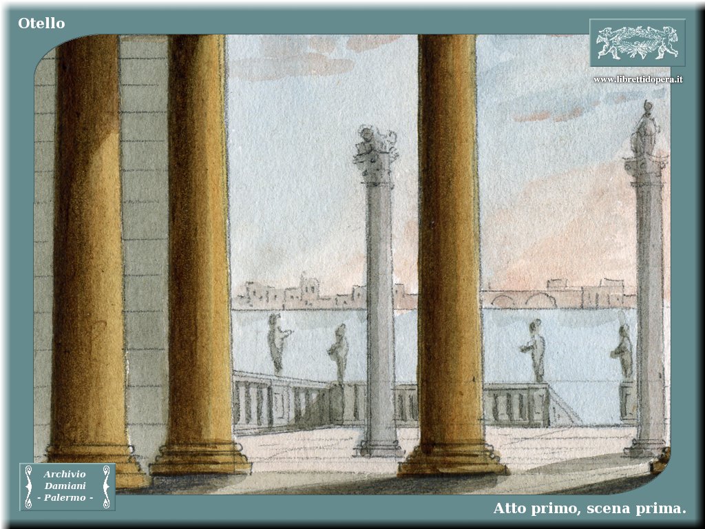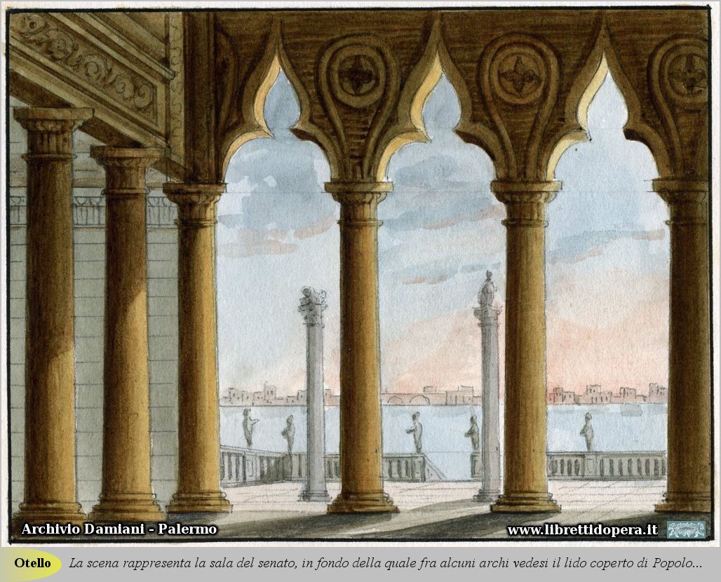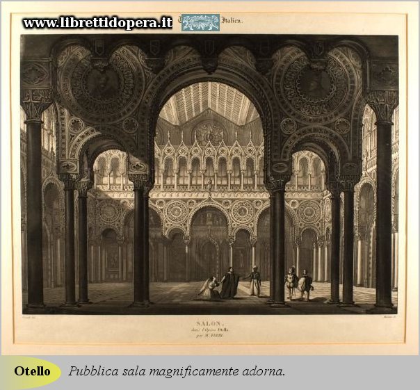 La scena rappresenta la sala del senato, in fondo della quale fra alcuni archi vedesi il lido coperto di Popolo che attende festoso lo sbarco di Otello. Navi in distanza. | ![]() |