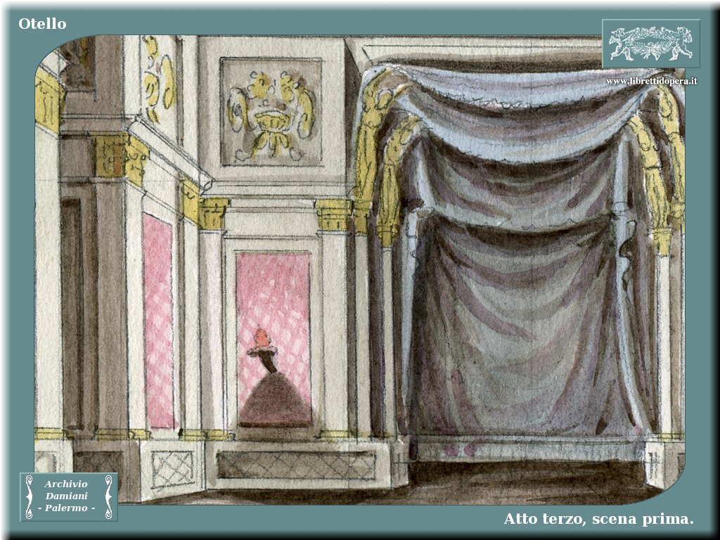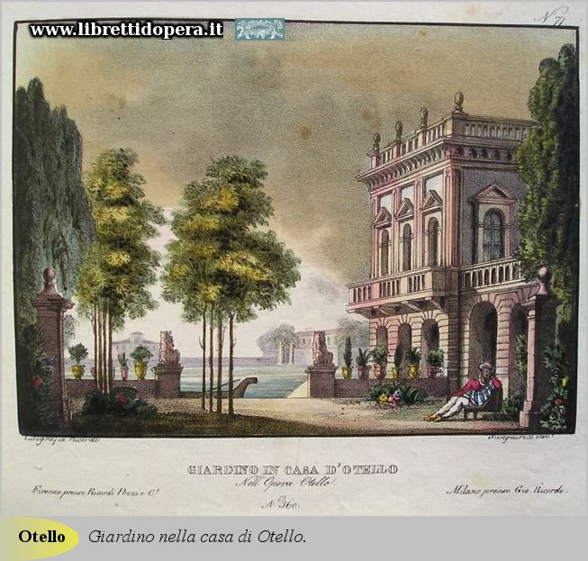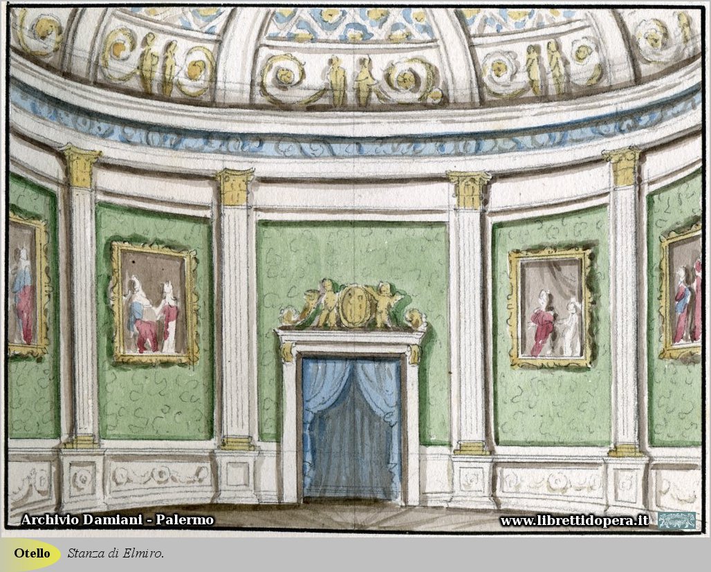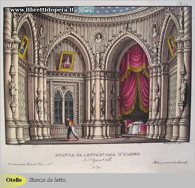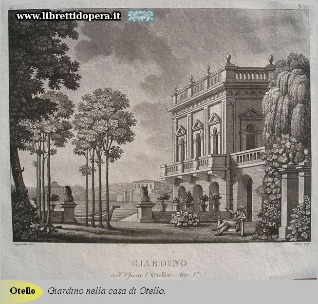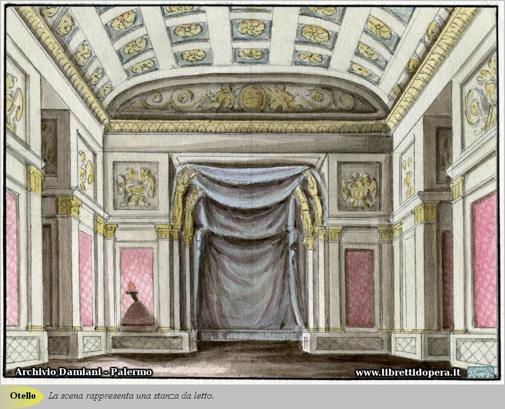 La scena rappresenta la sala del senato, in fondo della quale fra alcuni archi vedesi il lido coperto di Popolo che attende festoso lo sbarco di Otello. Navi in distanza. | ![]() |