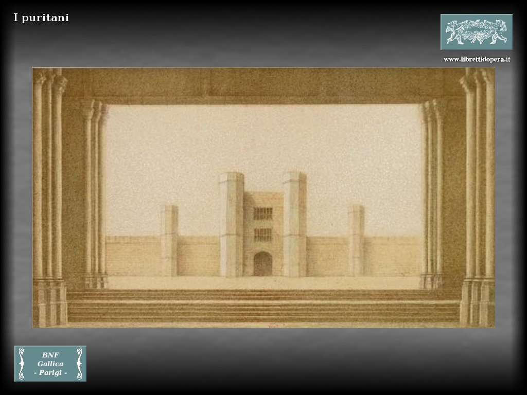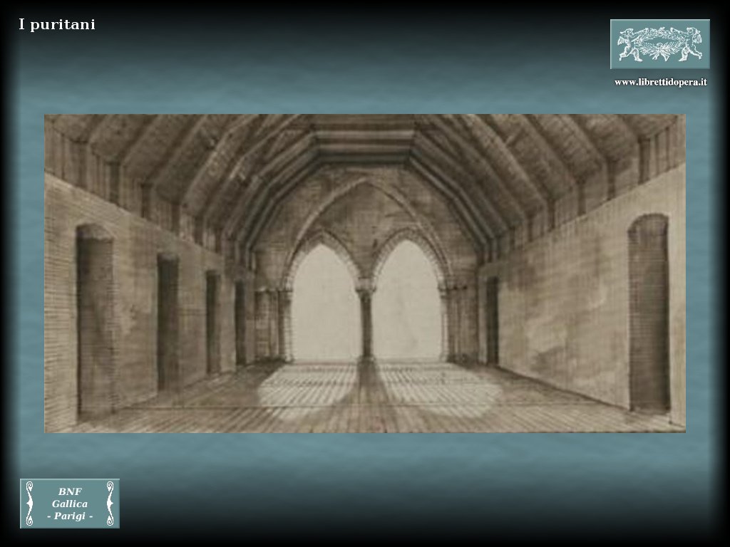 Sala d'arme con logge vaste, ove l'architettura gotica mostra la intera sua pompa; il fondo della scena è aperto; fra le colonne si veggono le fortificazioni. |