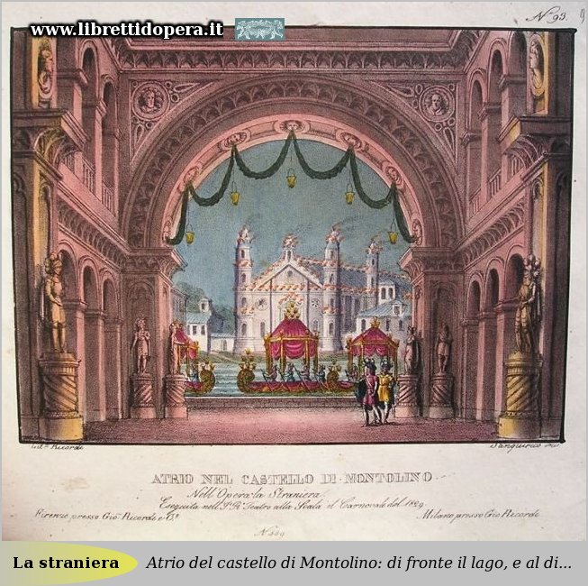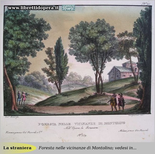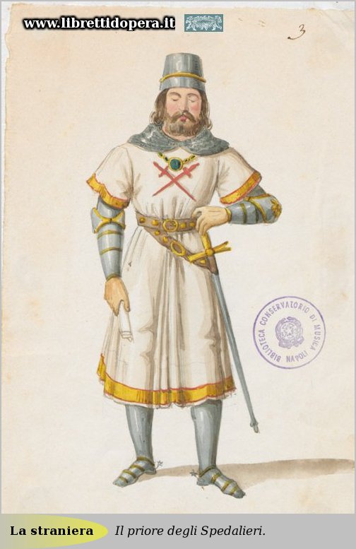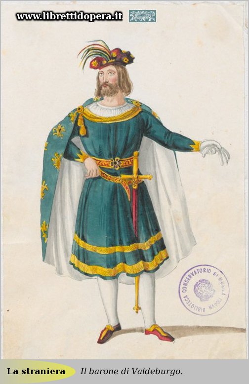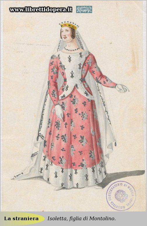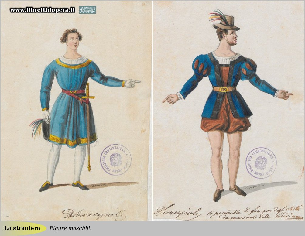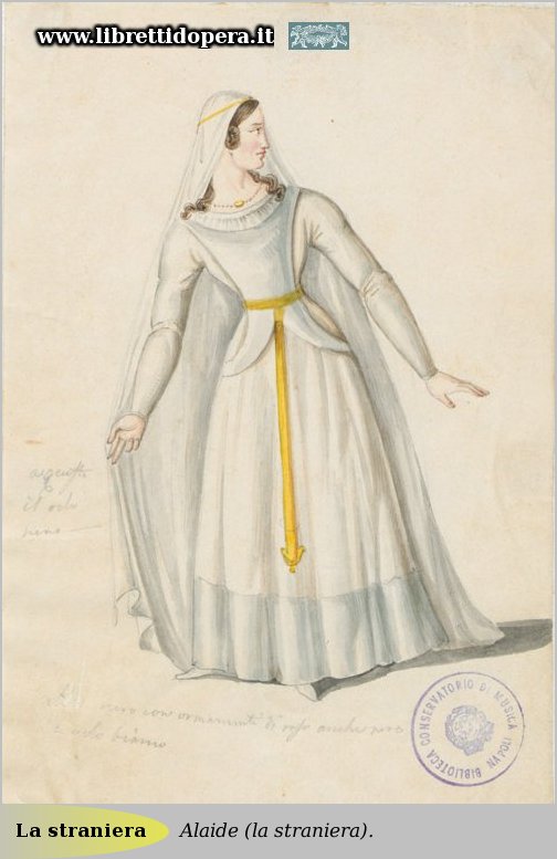 • Figurini per la rappresentazione de "La straniera" al Teatro San Carlo, Napoli, 1835 Internet culturale, Biblioteca del Conservatorio di musica S. Pietro a Majella. |